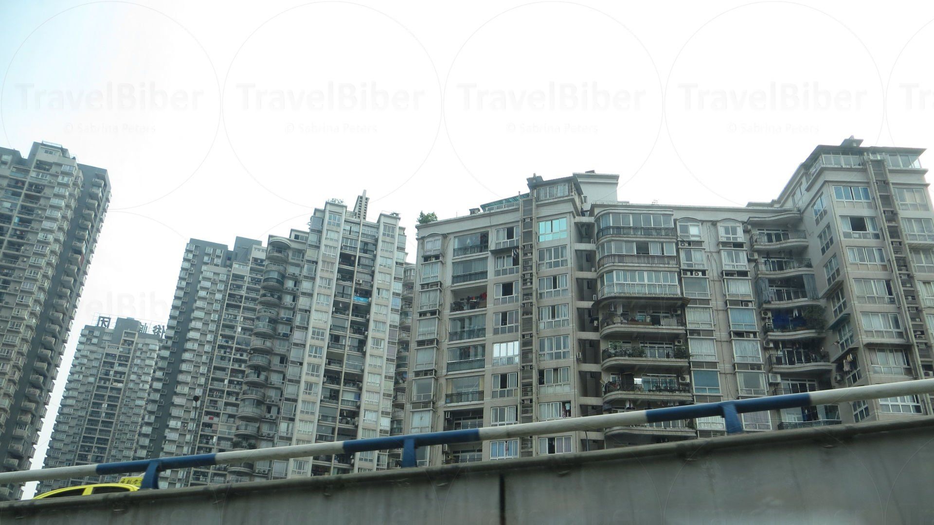 Vorbeifahrt an einer typischen Hochhaus-Häuserfront in Chongqing. Auf der breiten mehrspurigen Autobahn ging es tiefer rein in die Stadt.