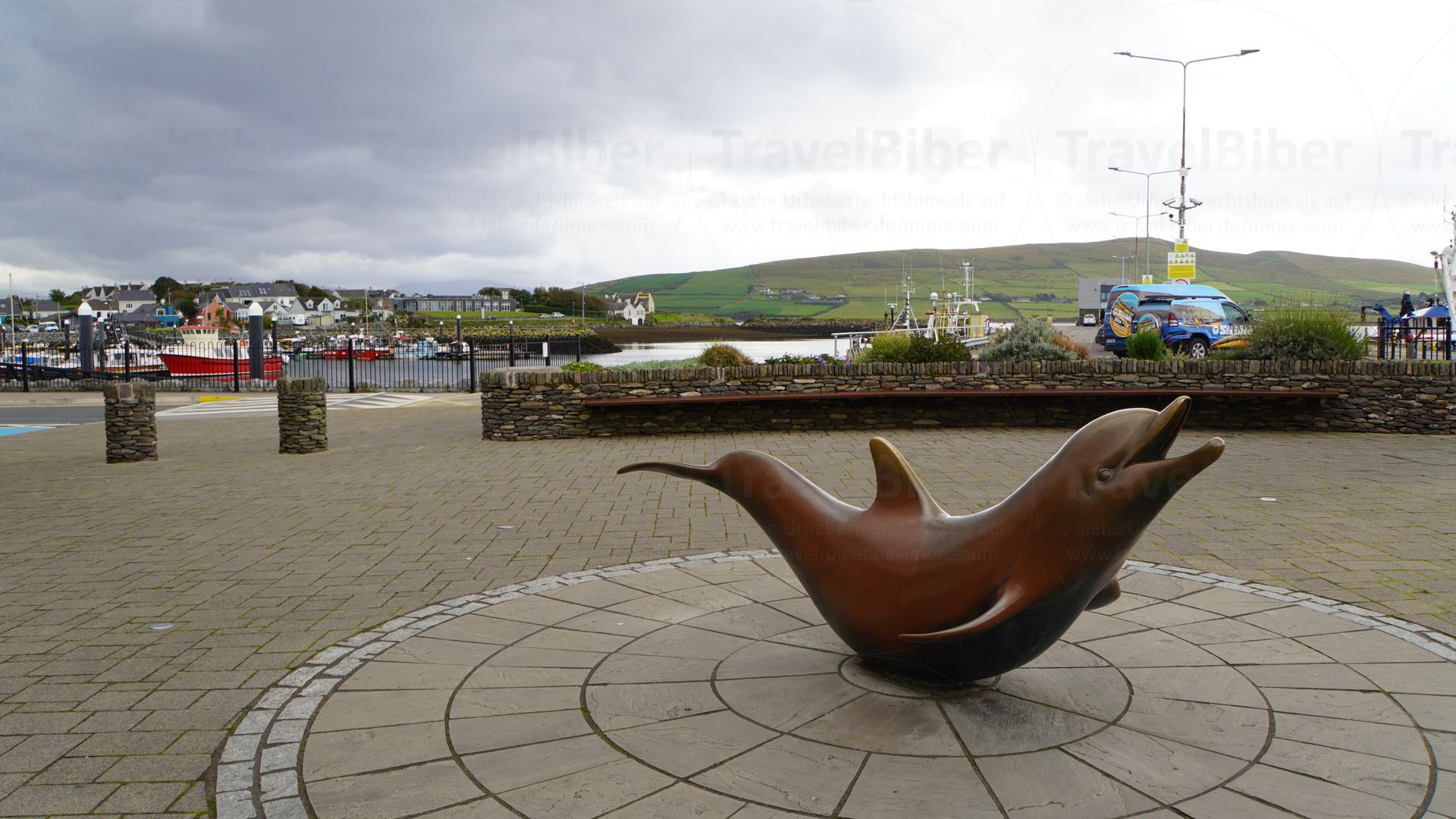 Ankunft in Dingle. Hier zu sehen ist die Statue vom Delfin Fungie, der sich fast vierzig Jahre lang im Hafen und Bucht von Dingle aufhielt.