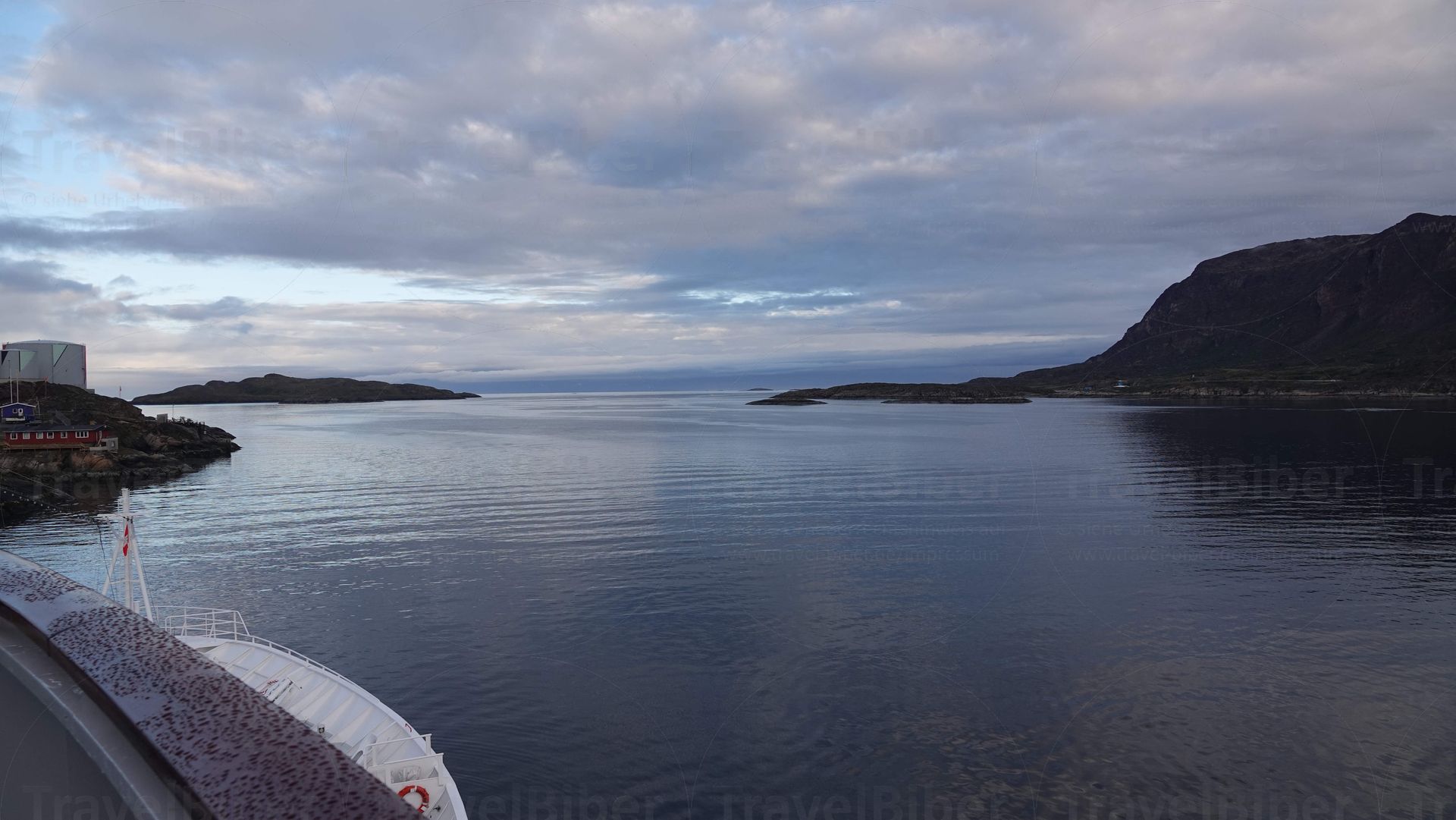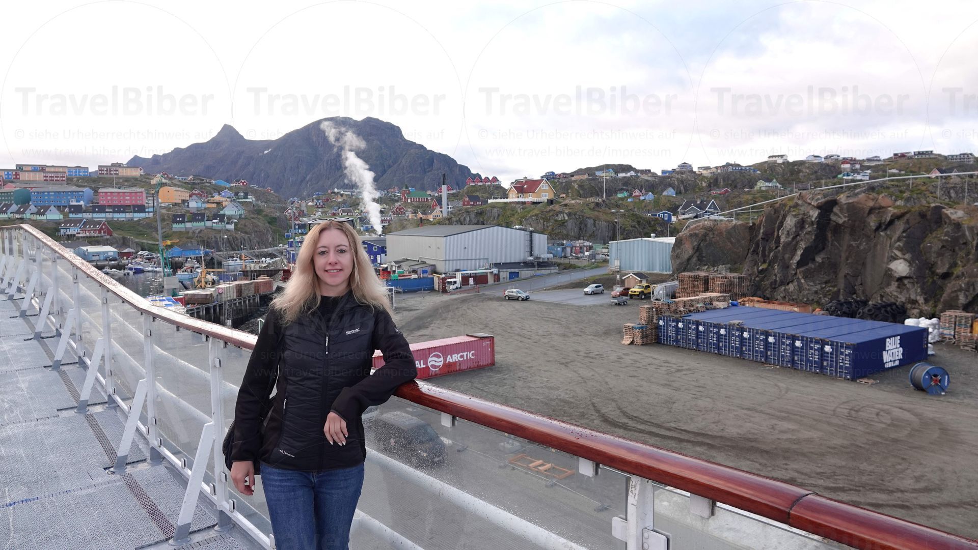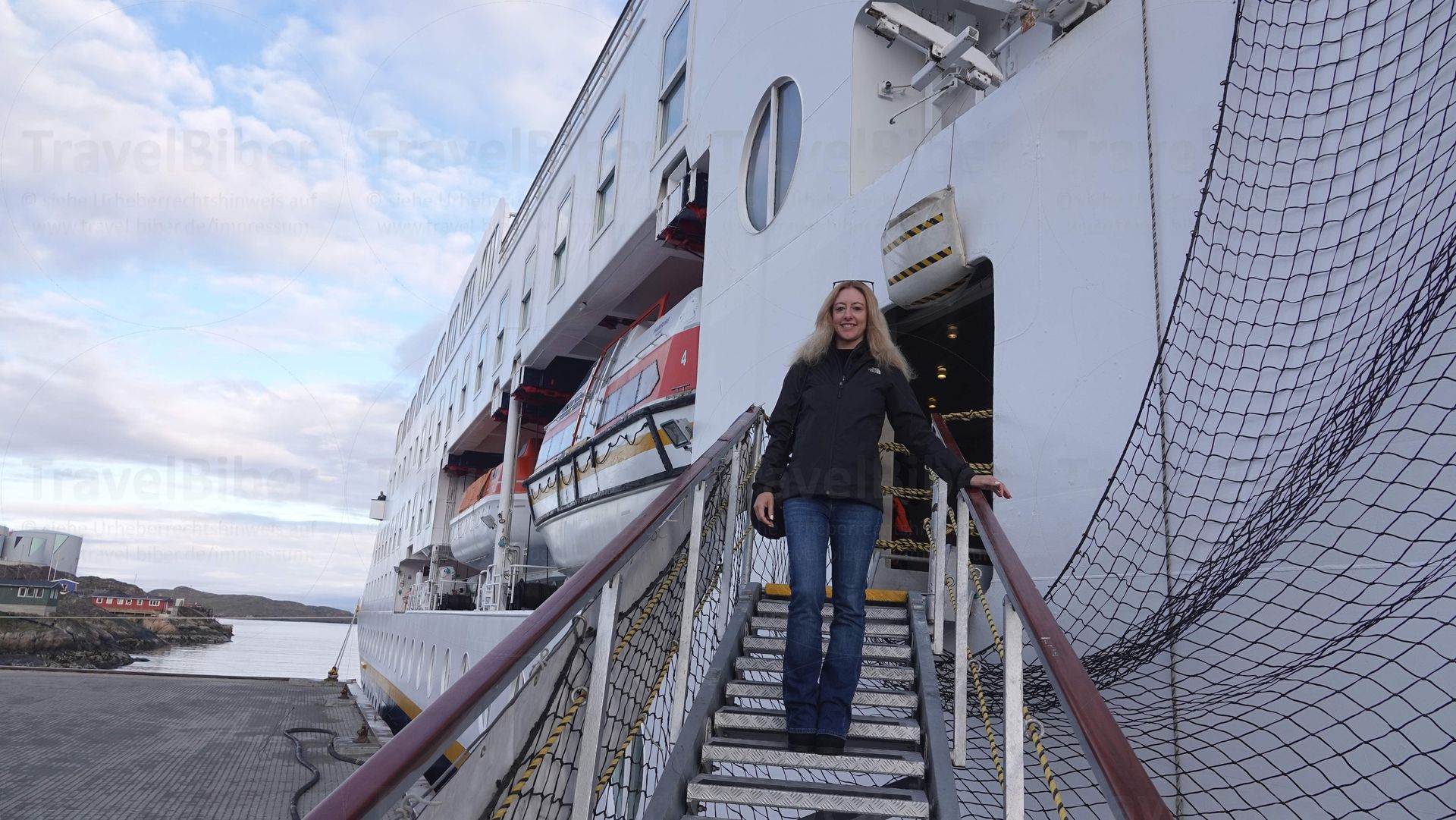 Das Schiff befindet sich kurz vor dem Anlegen am Pier in Sisimiut. Noch ist der Himmel bewölkt, die Sonne traut sich noch nicht so ganz raus.