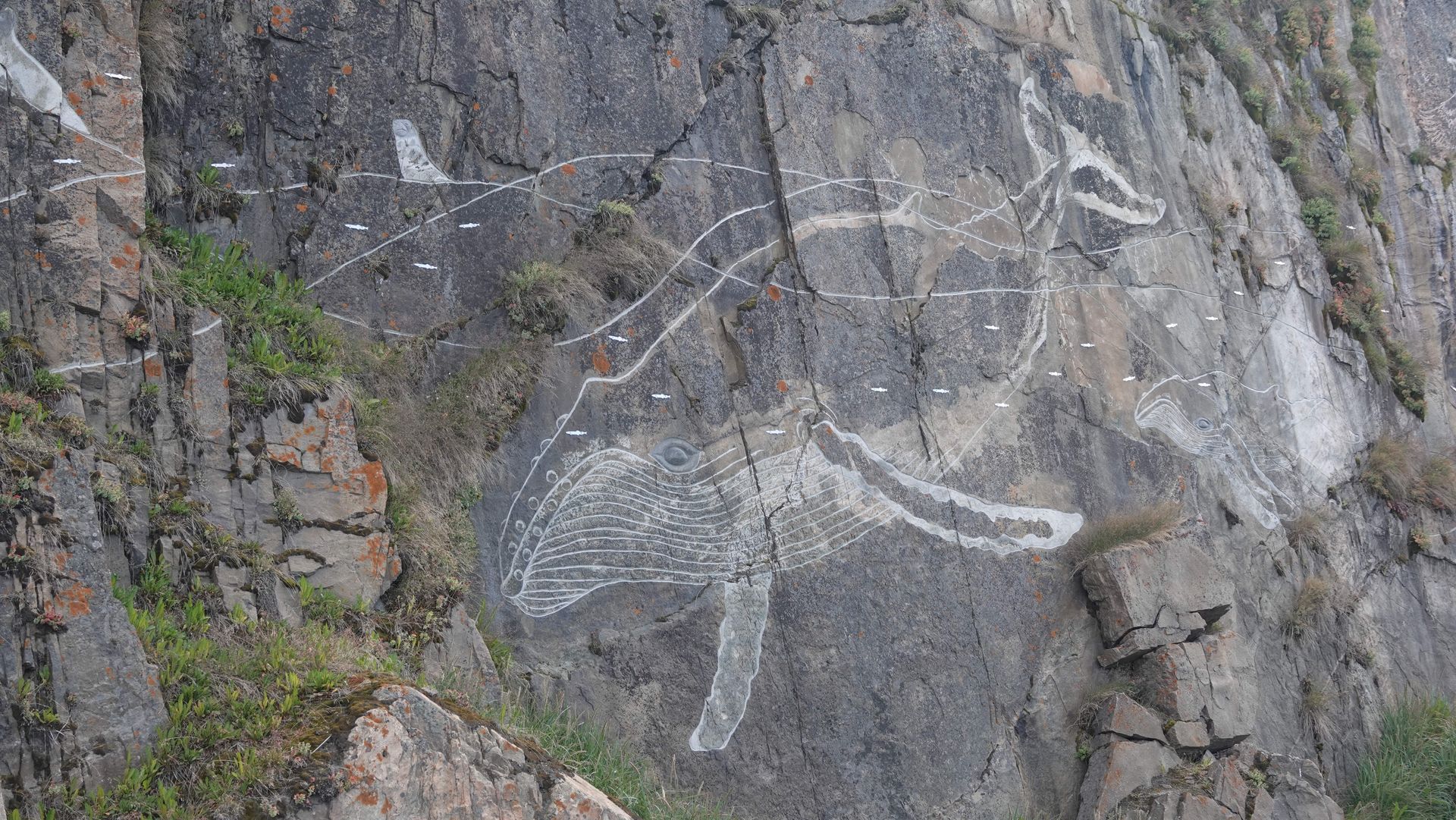 Gegenüber des alten Kolonialviertels an der Felswand ein eingeritzter Wal ...