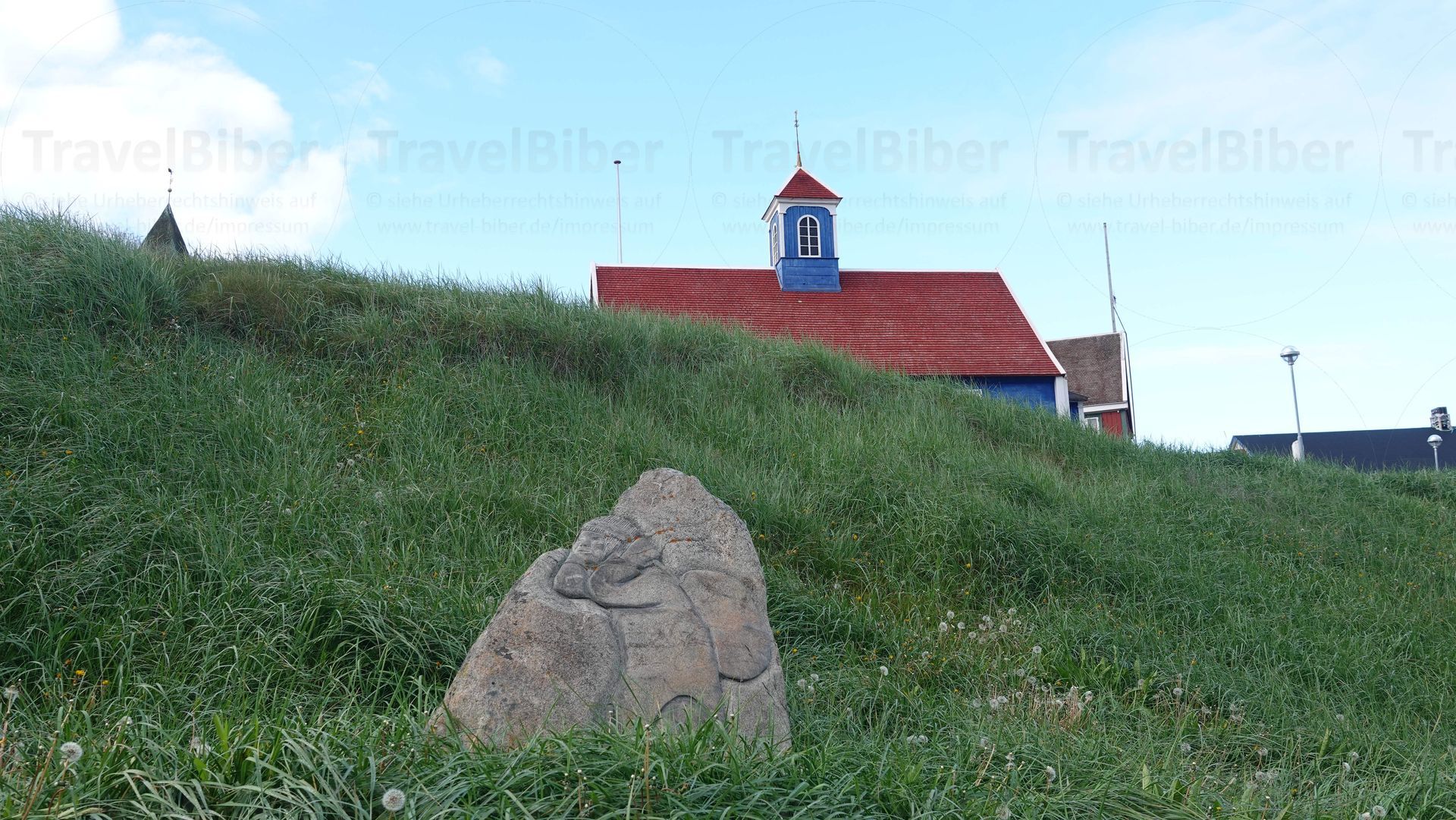 Hinter dem mit Gras bewachsenen Hügel und der kleinen hübschen Skulptur im Vordergrund, direkt an der Hauptstraße des Ortes, liegt die alte blaue Berthel-Kirche