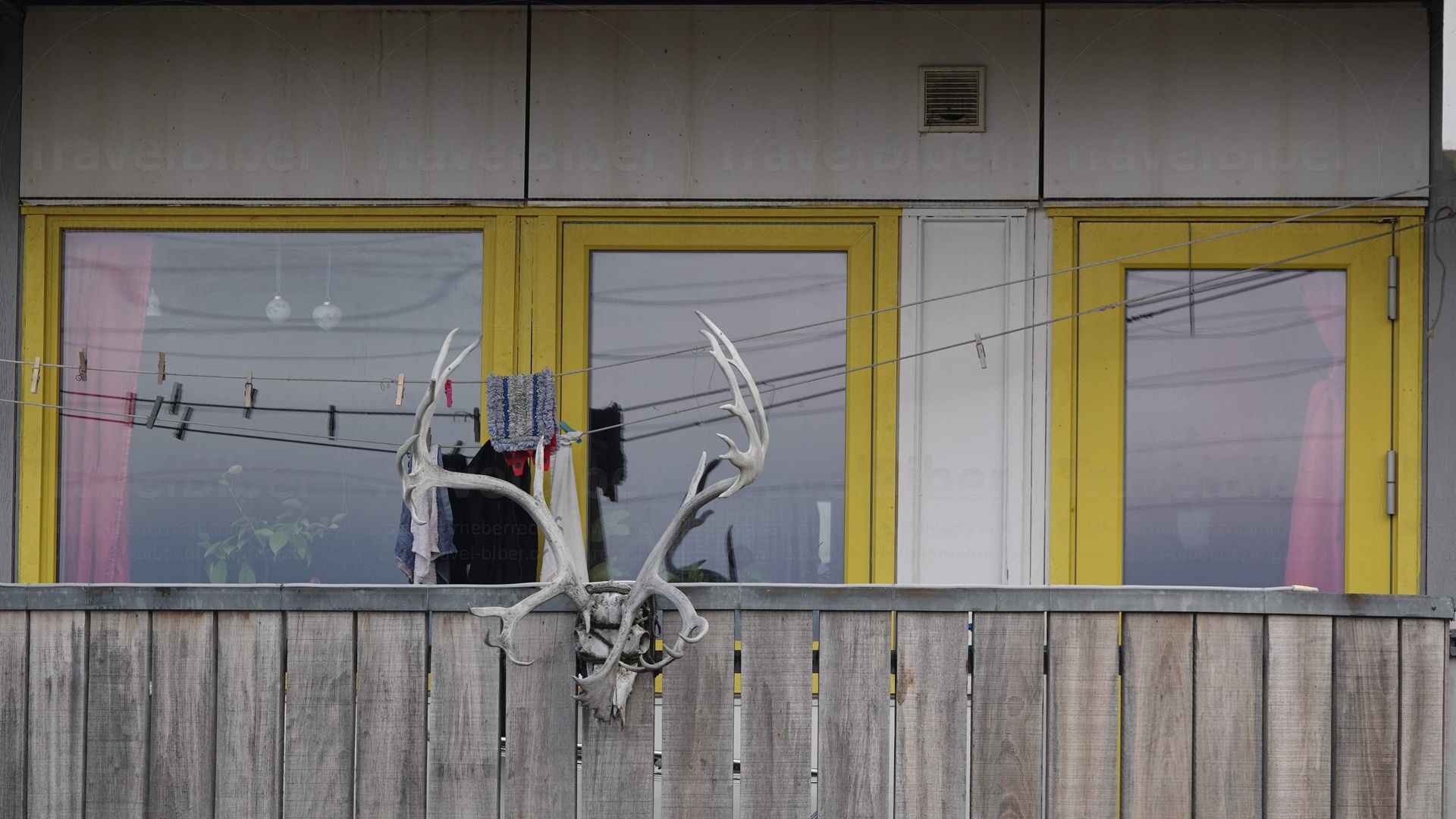 So wohnt man dann wohl in Grönland; mit Jagdtrophäe auf dem Balkongeländer.