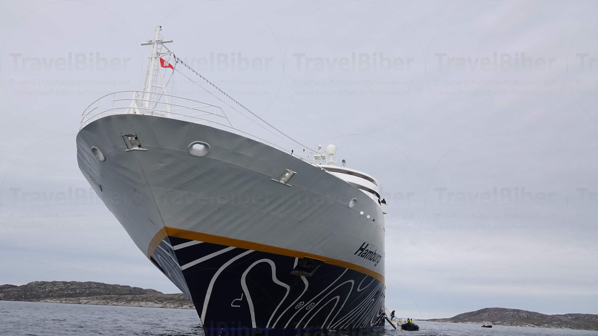 (Baffin Bay), zurück in die Diskobucht, am 17. August 2025. Schon am Vorabend war das Schiff von Upernavik losgefahren, und nun geht es entlang der grönländischen Küste nach Süden. Auf den Foto sieht man
