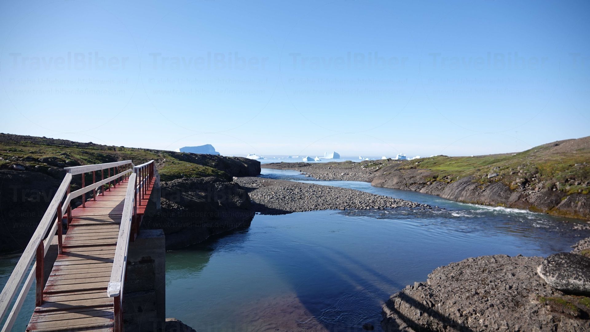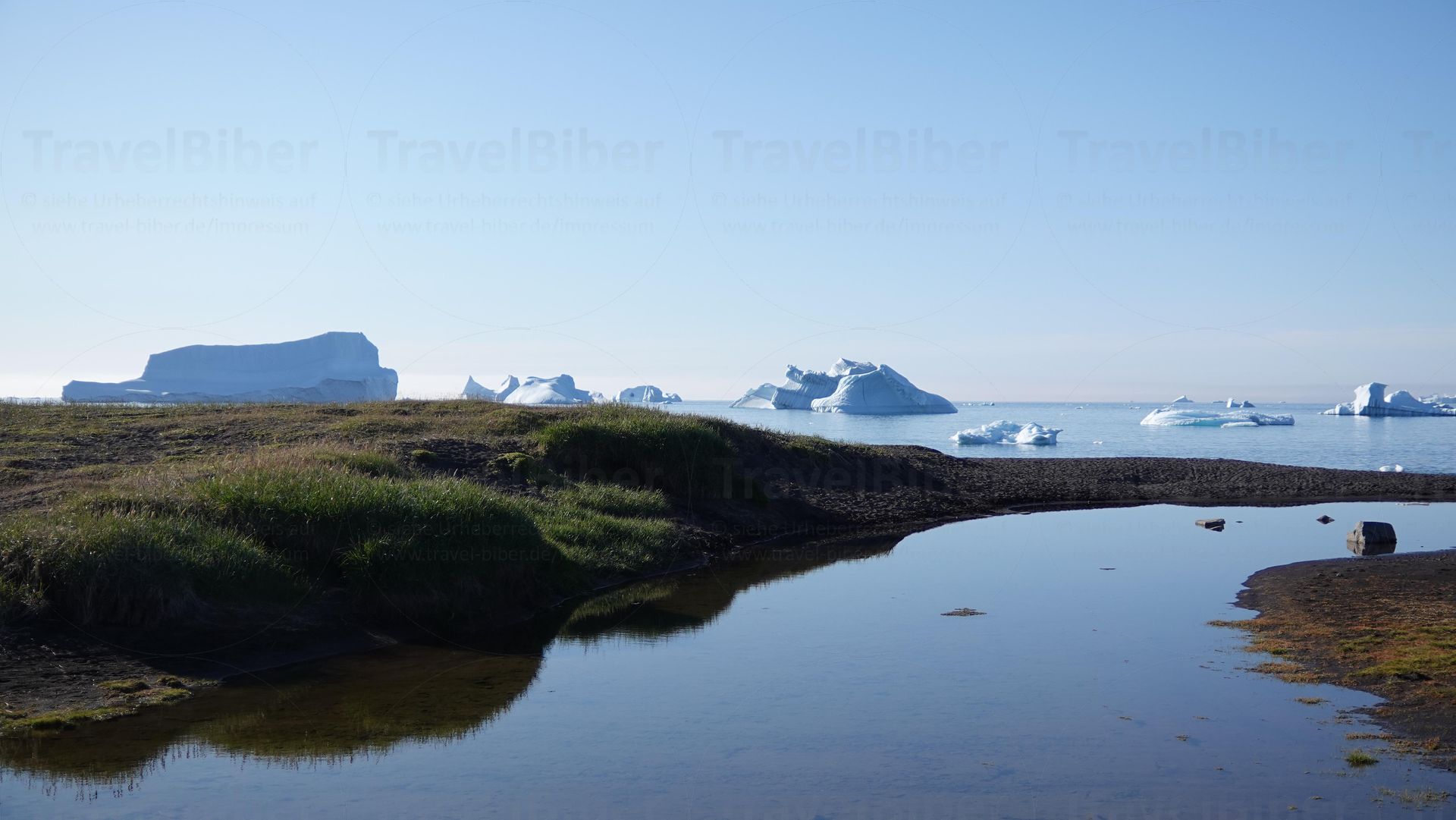 Grüne Graslandschaft, blaues Meer und weiße Eisberge.