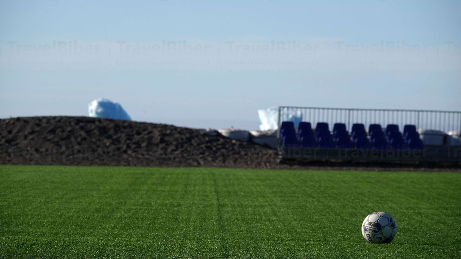 Auch so weit im Norden gibt es einen Fußballplatz, mit Kunstrasen, dahinter sieht man Eisberge auf dem Meer. Ein verrückter Anblick irgendwie.