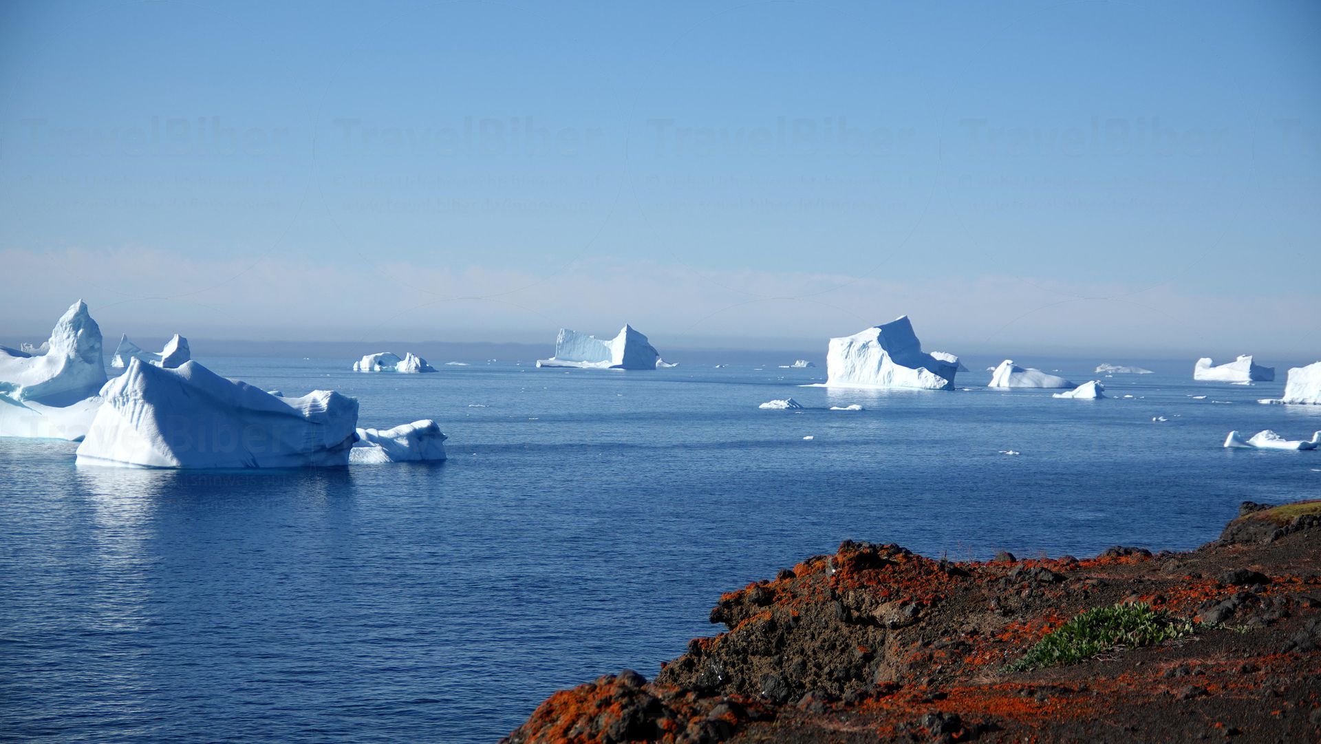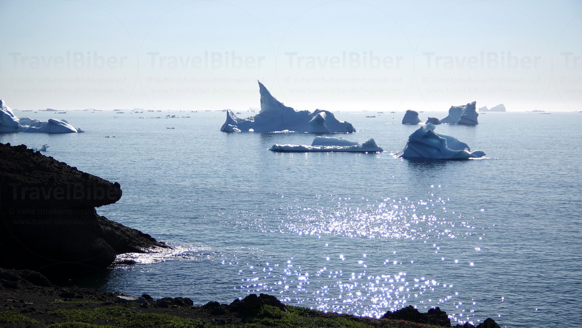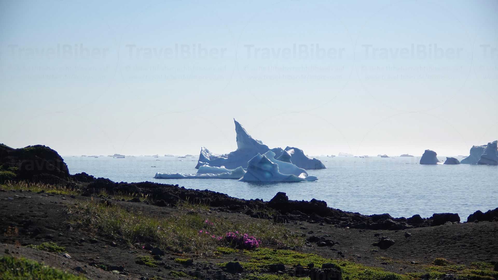 Was für eine einzigartige Aussicht mit größere und kleinere Eisbergen, die vor der Küste der Insel schwimmen.