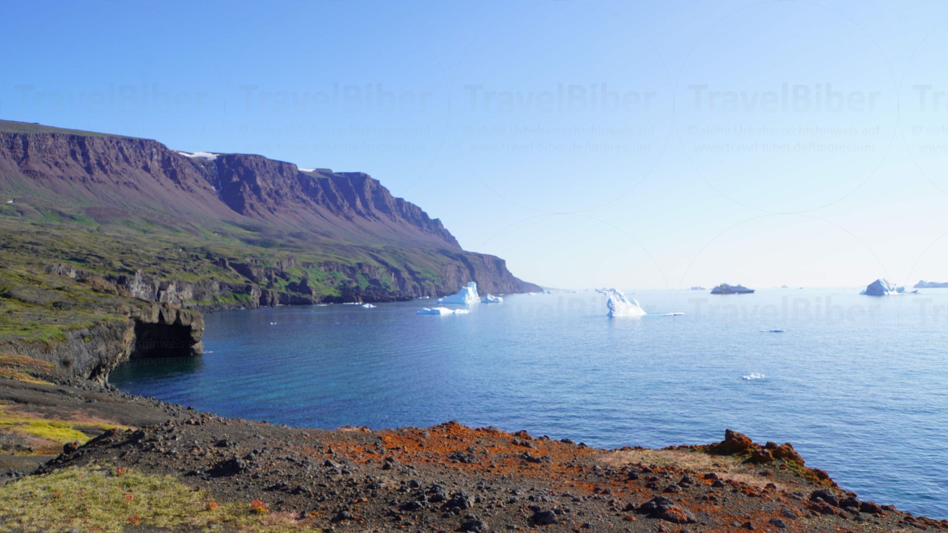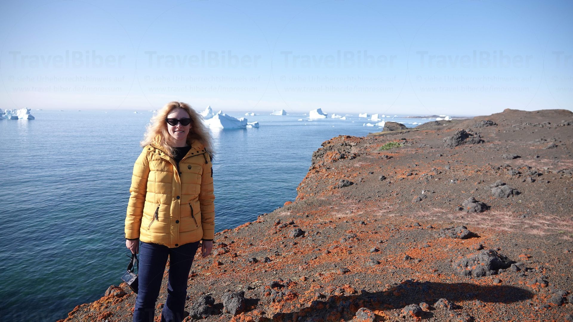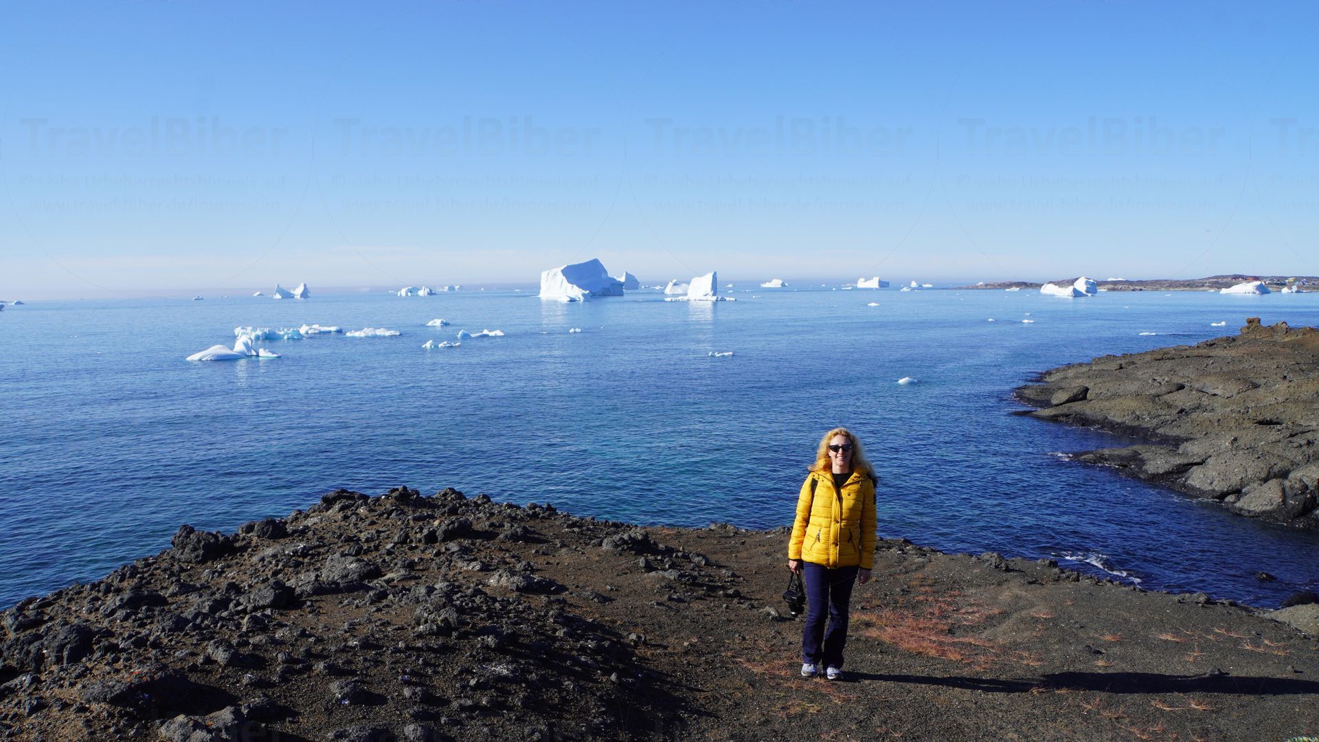 Was für eine einzigartige Aussicht mit größere und kleinere Eisbergen, die vor der Küste der Insel schwimmen.