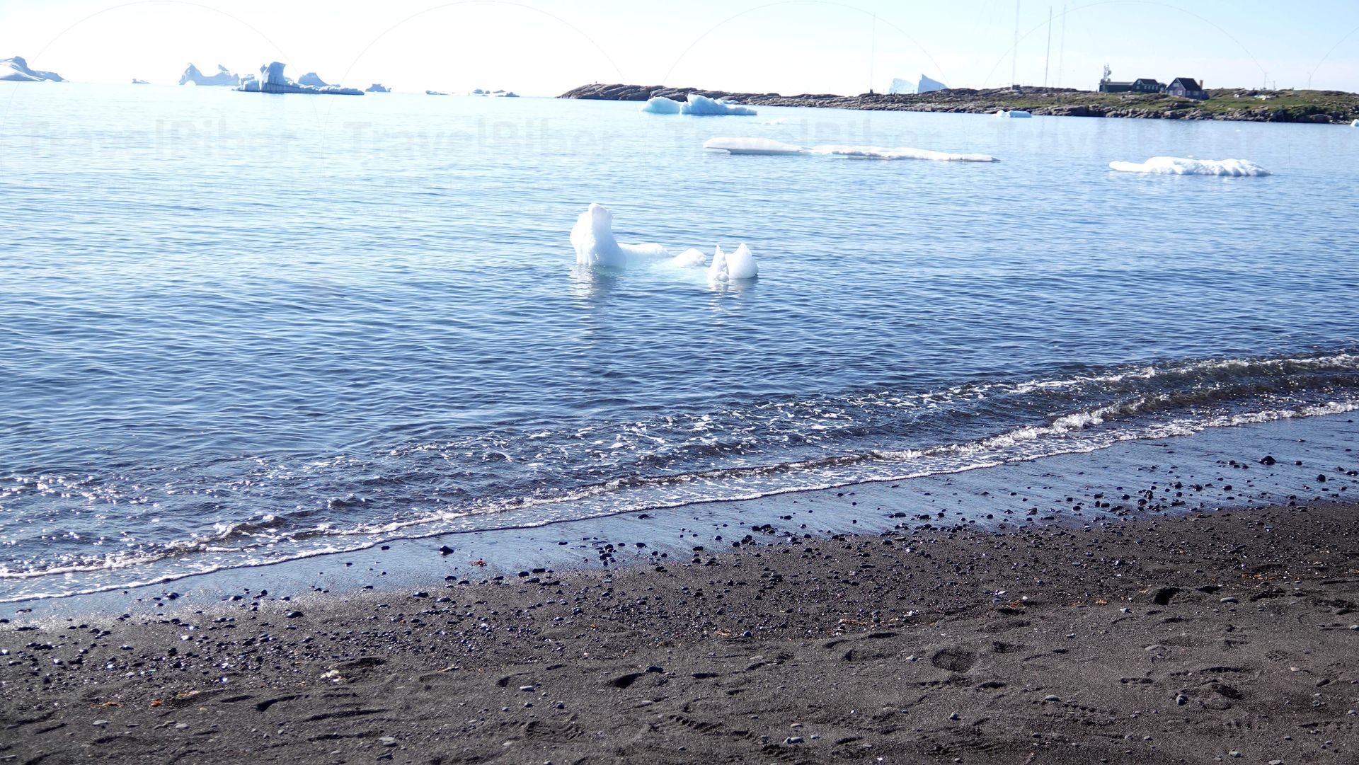 Grooße und kleine Eisberge vor dem Strand.