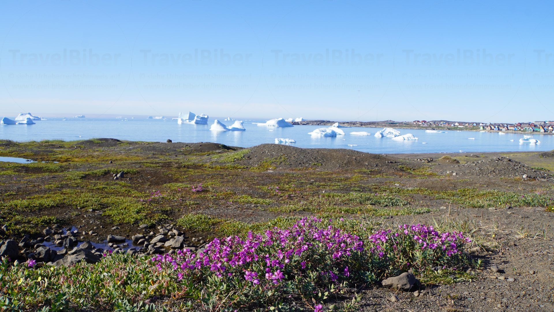 Schwarze Erde und weiße Eisberge; im Hintergrund sieht man die bunten Häuser des Ortes Qeqertarsuaq.