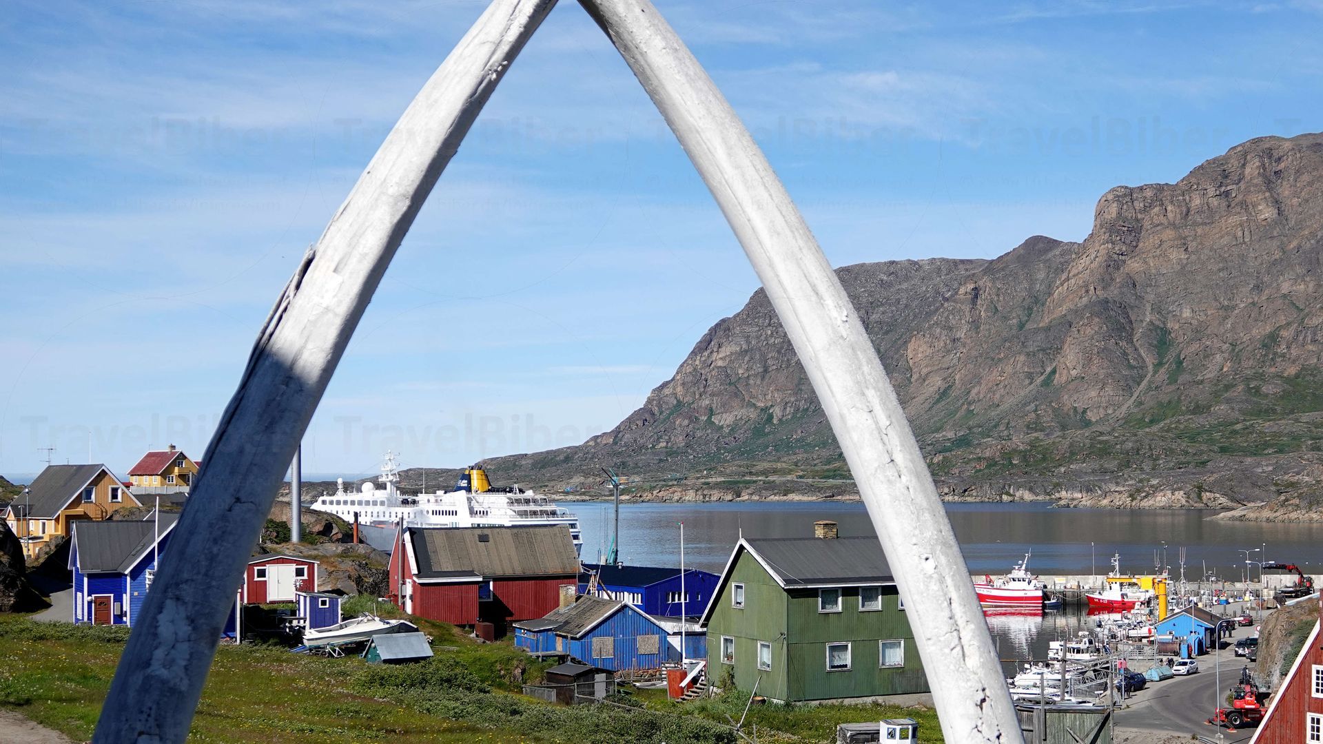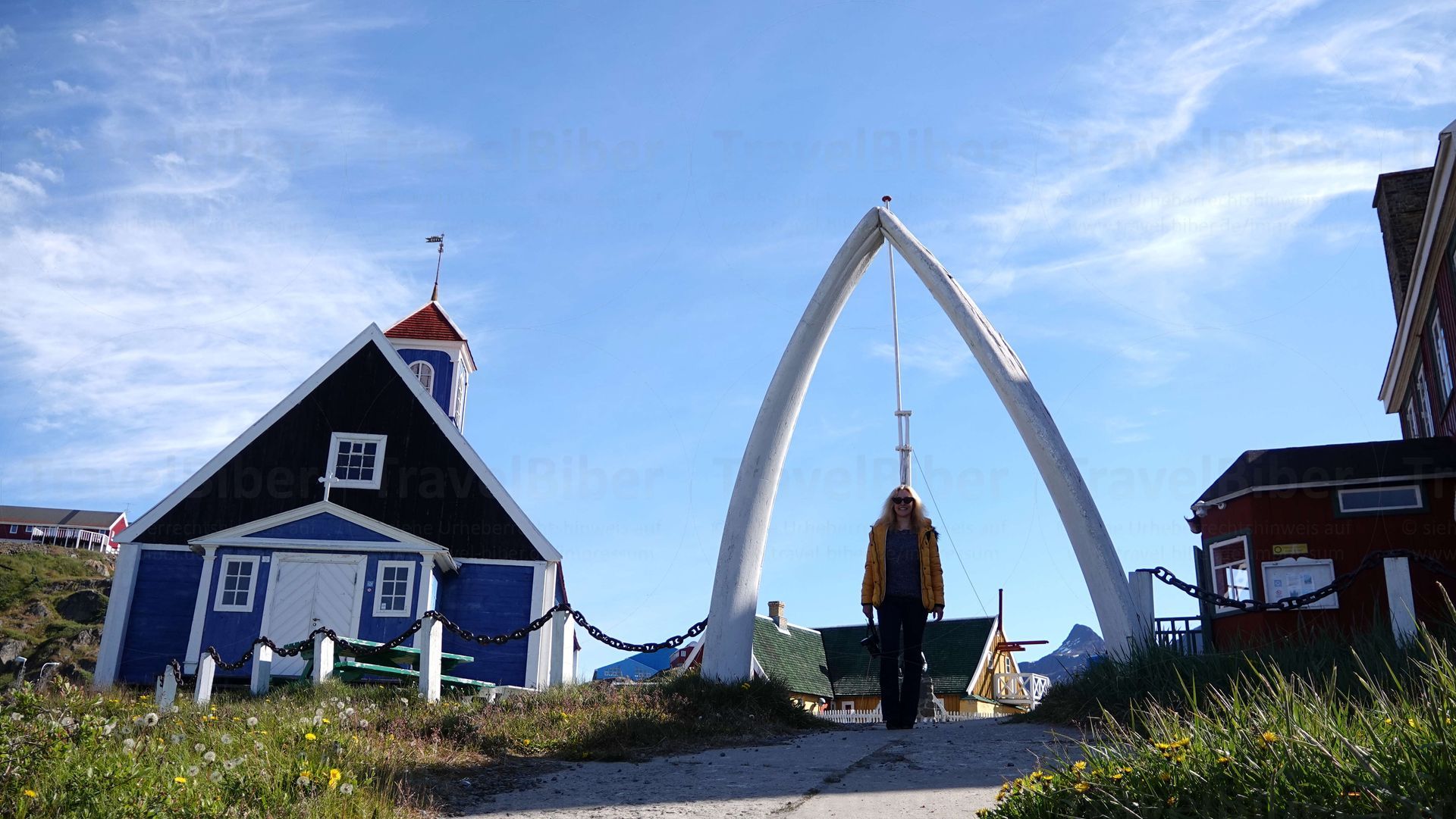 Dahinter ein paar hübsche alte Häuser. Die Walknochen stammen von einem Grönlandwal, der in der Nähe der Stadt an Land getrieben wurde.