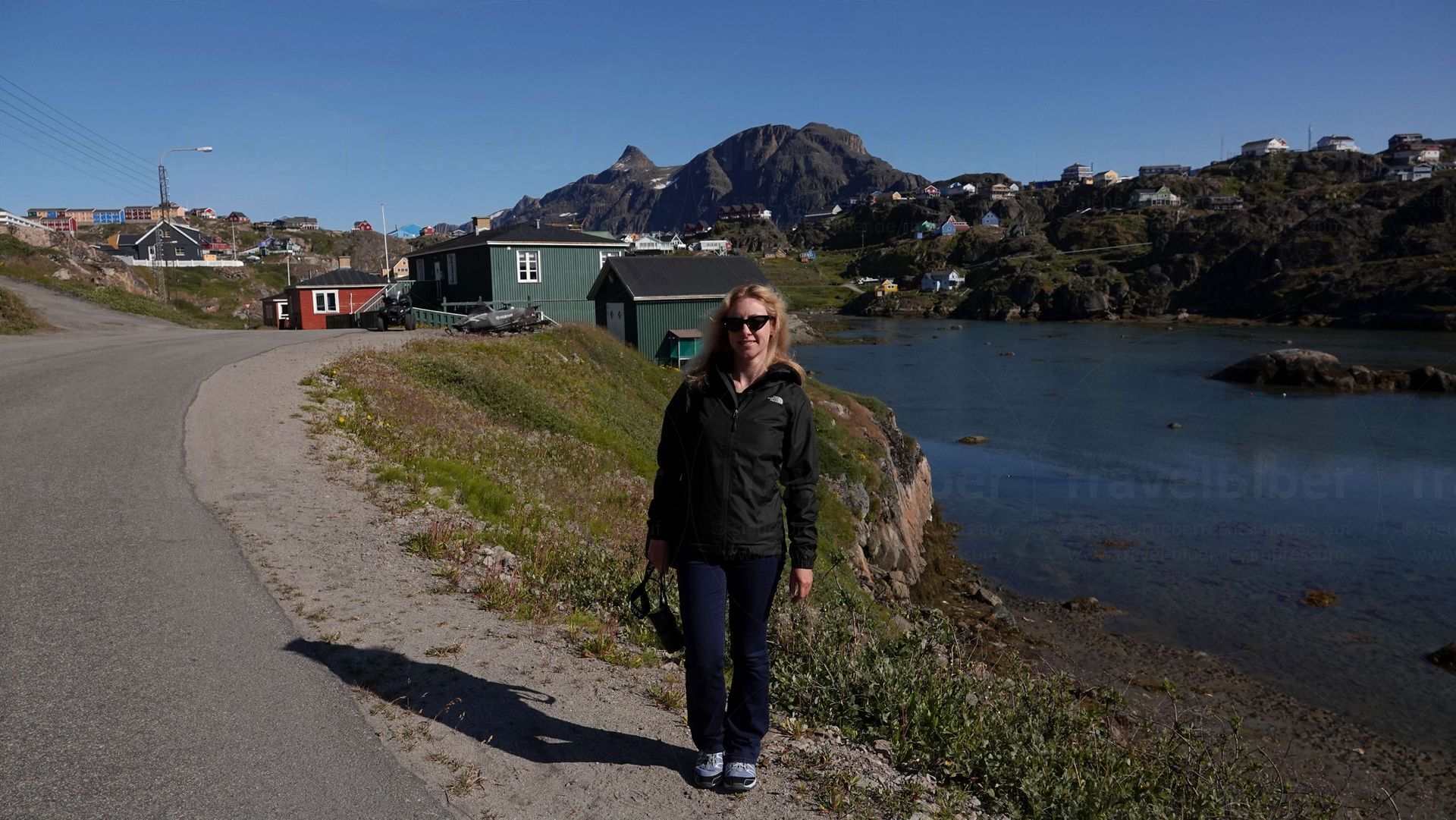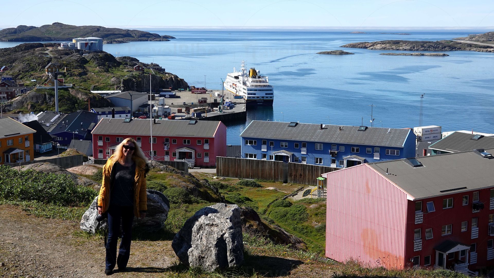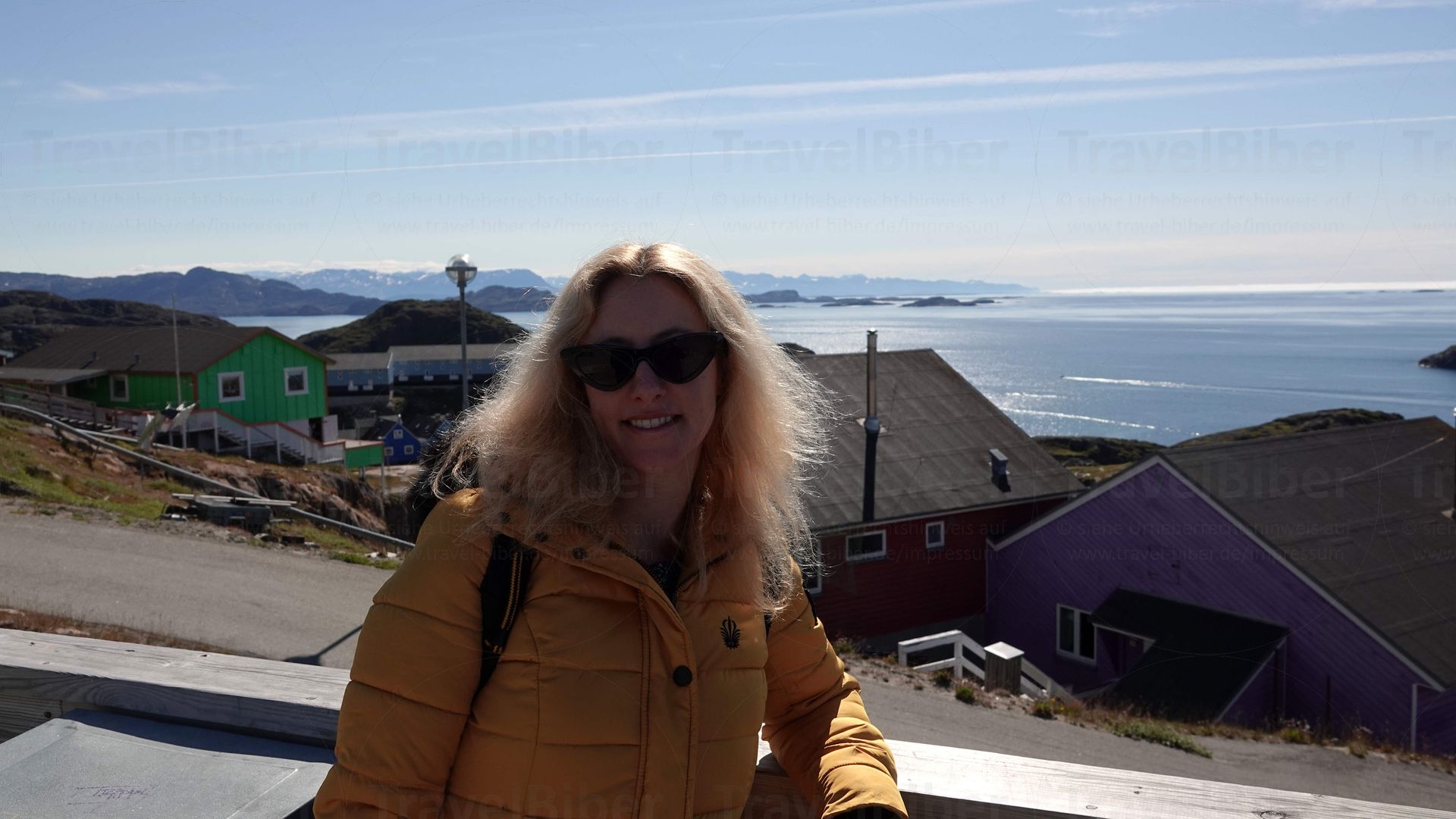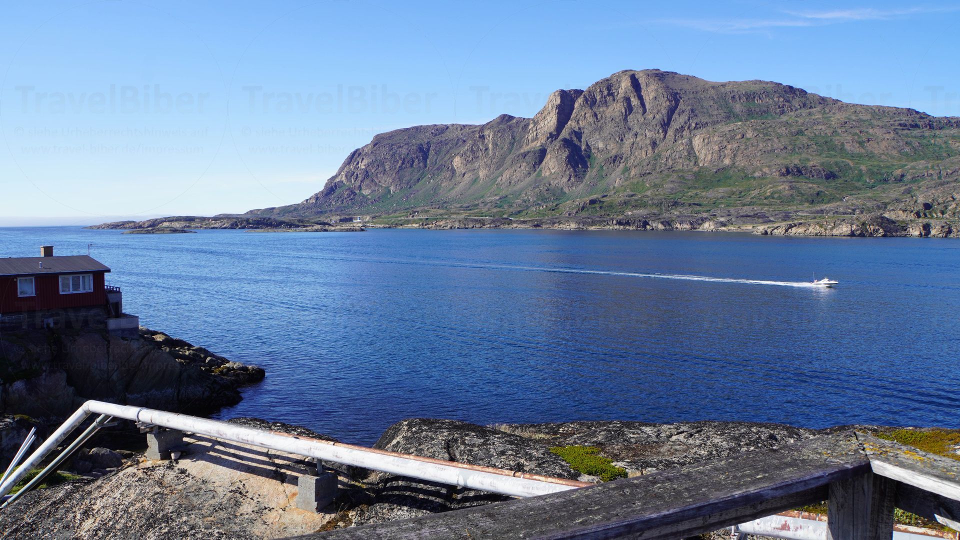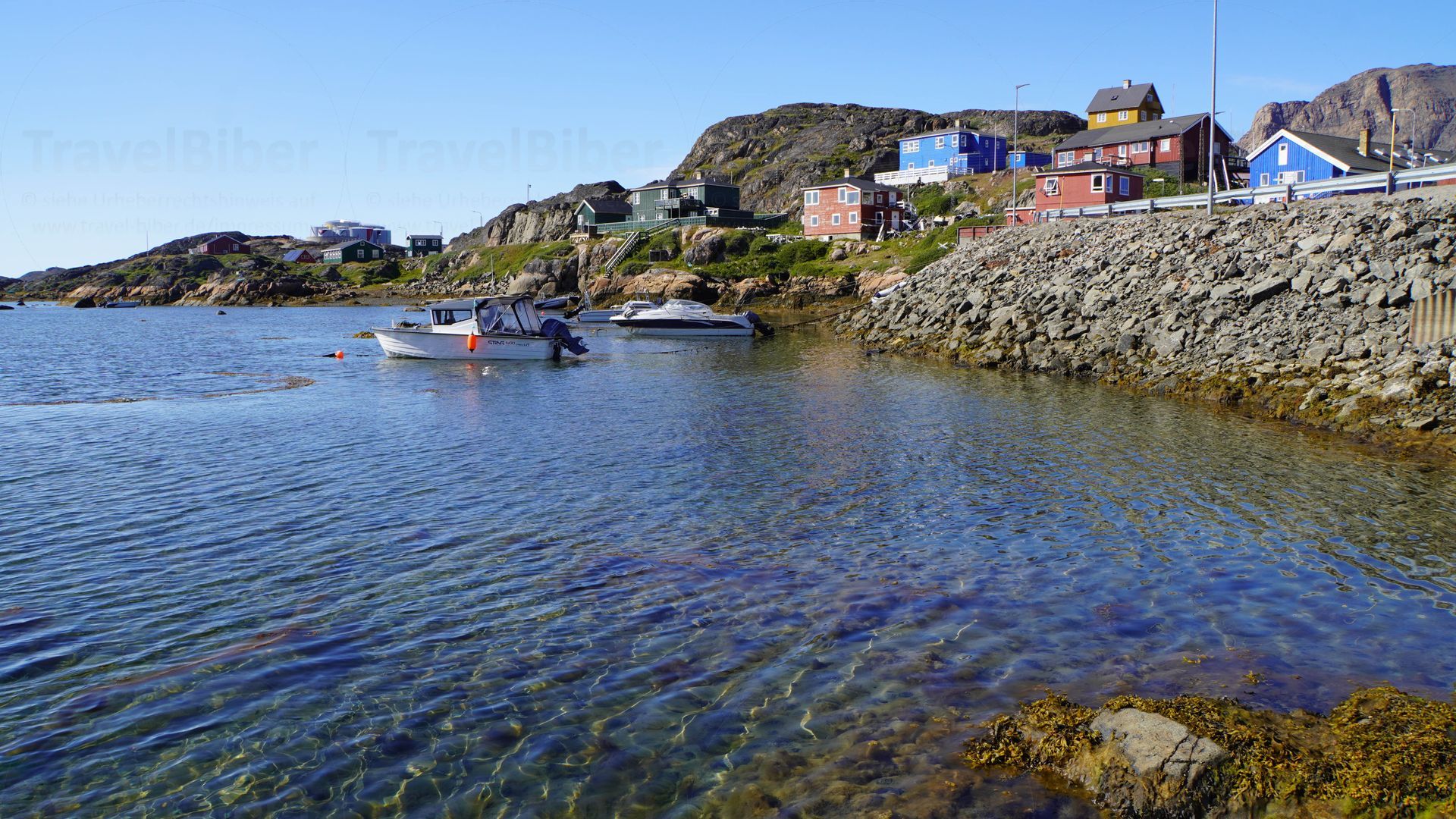 an mit Blick auf Sisimiut. Dahinter sieht man dein Eingang zum alten Hafen.