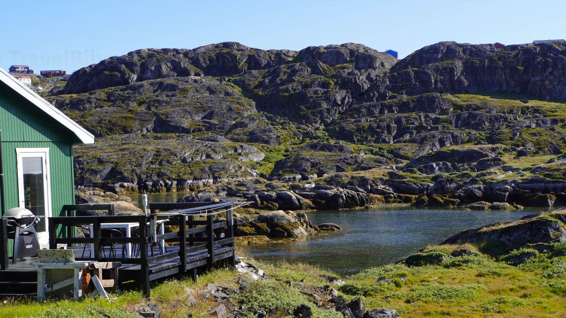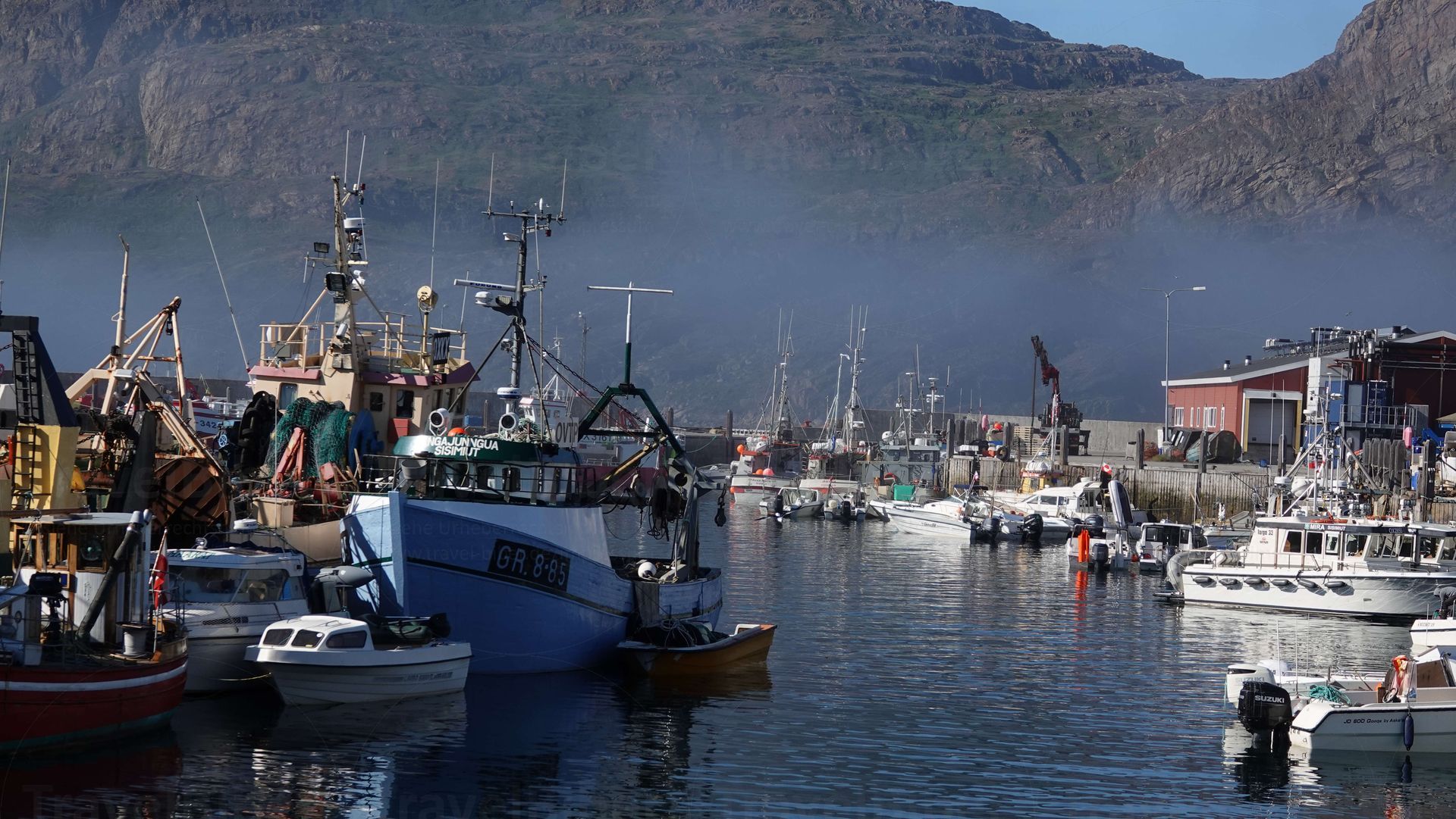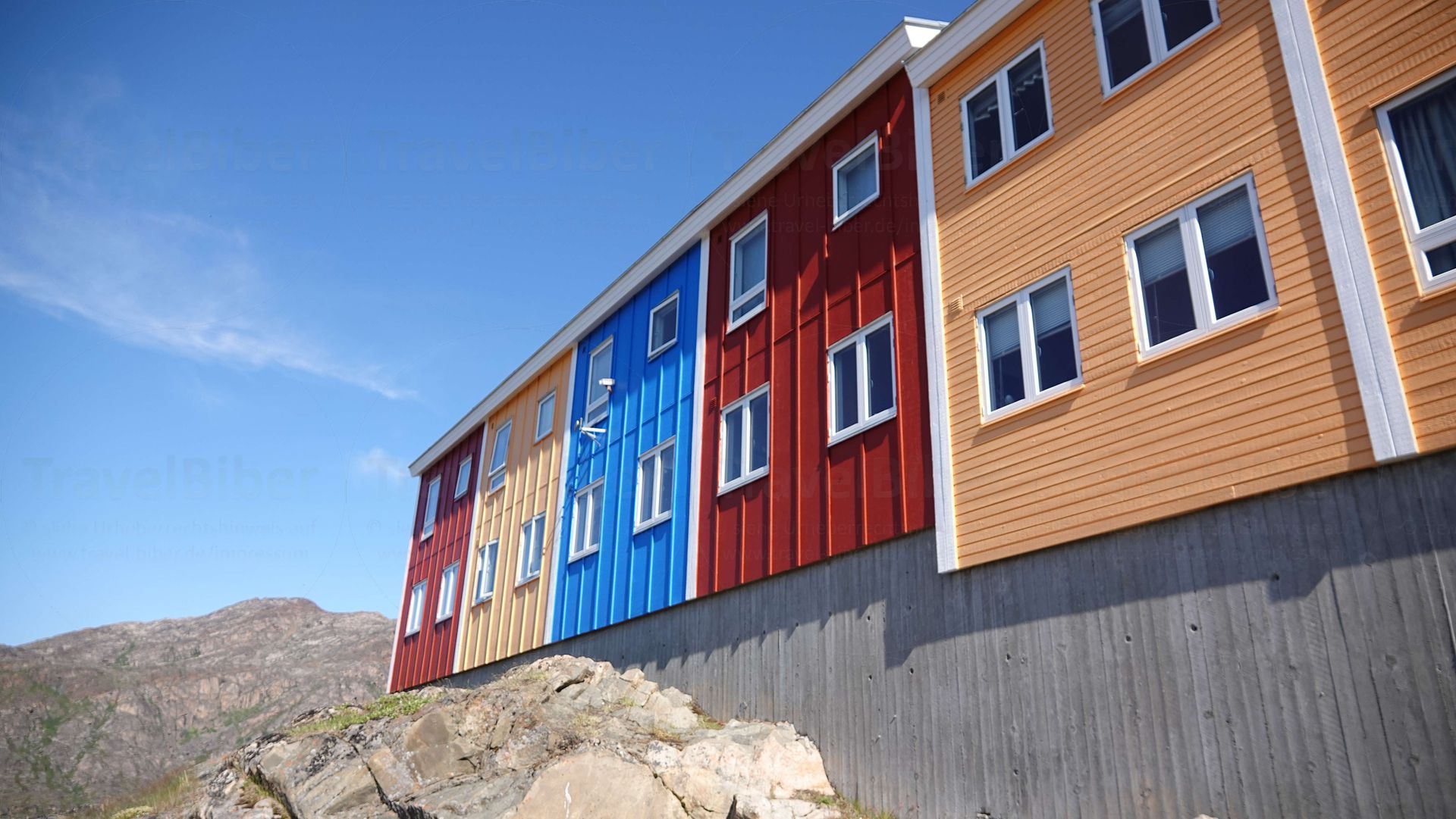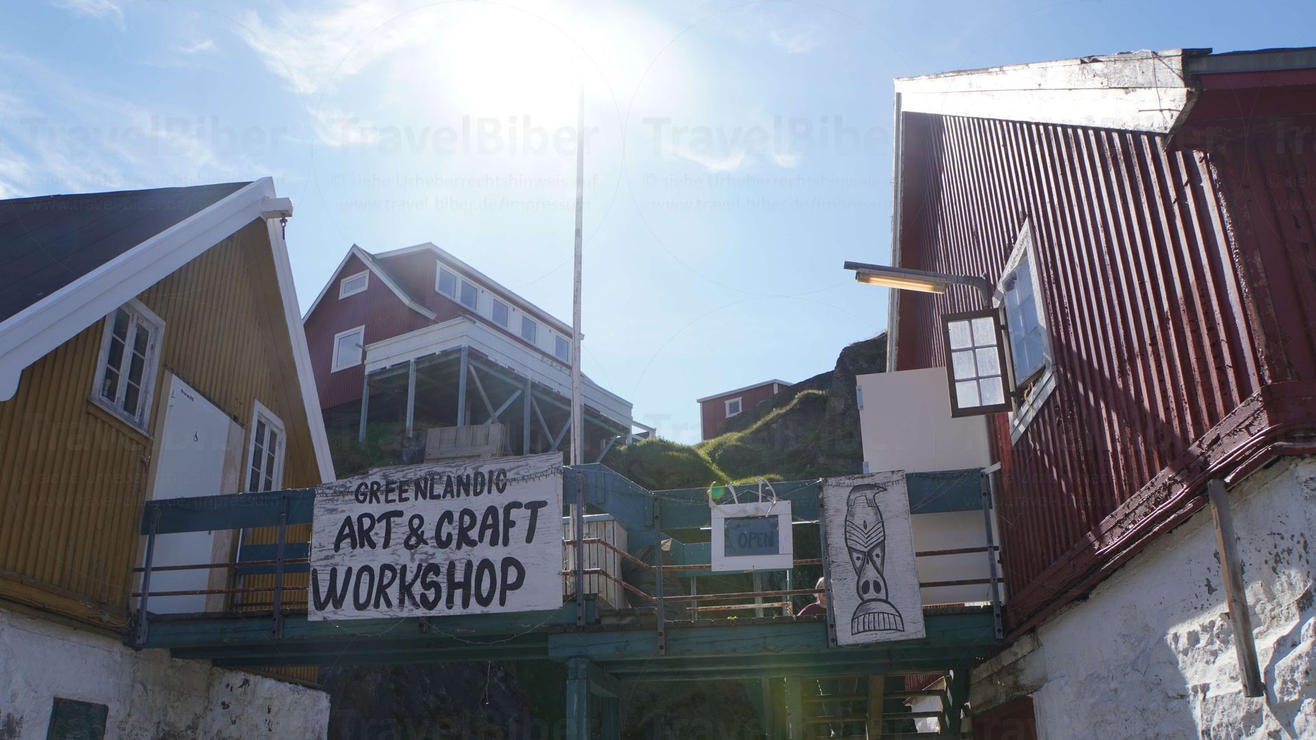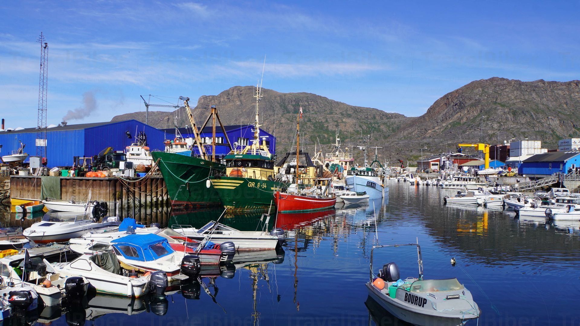 an mit Blick auf Sisimiut. Dahinter sieht man dein Eingang zum alten Hafen.