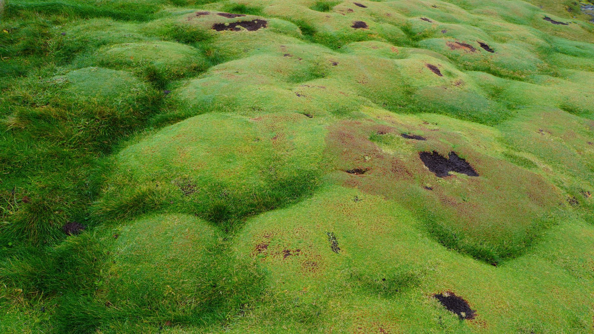 Lauter kleine Grashügel, die leicht nachgeben, wenn man drauftritt.