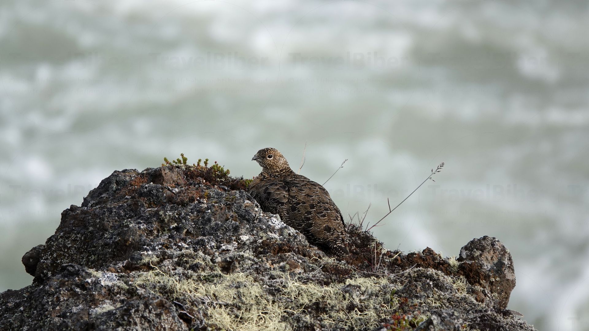Direkt am Fluss auf dem Weg zum Wasserfall tummeln sich ein paar Schneehühner. Sie sind echt gut getarnt.
