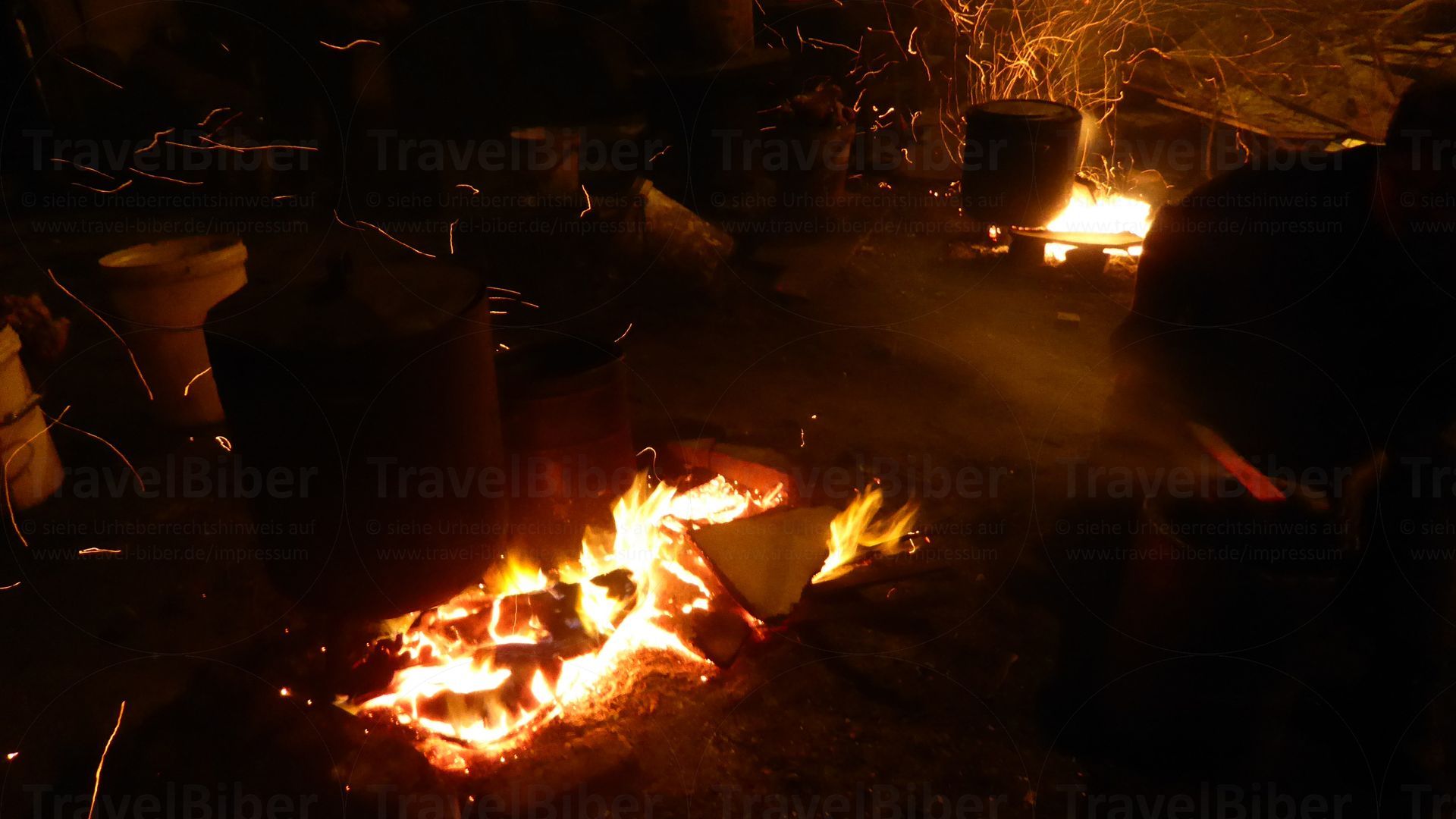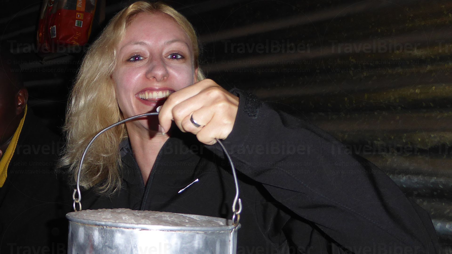Selbstgebrautes Maisbier in der Bar in den Townships. Der Eimer wird im Kreis, um das Feuer herumsitzend, umhergereicht.