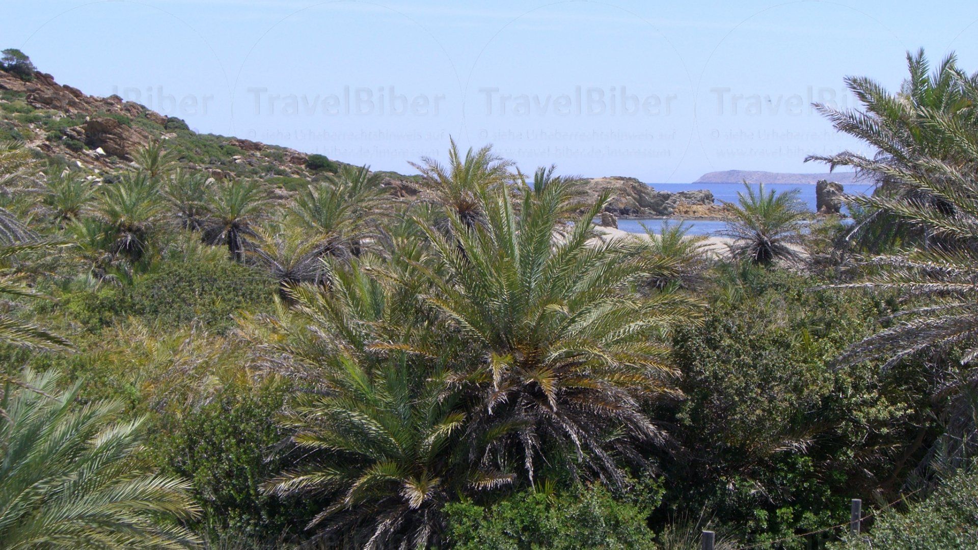 an der Ostküste der Mittelmeerinsel Kreta, an der Bucht von Grandes. Die Dattelpalmen bilden hier den größten natürlichen Palmenhain Europas, mit Palmen soweit das Auge reicht.