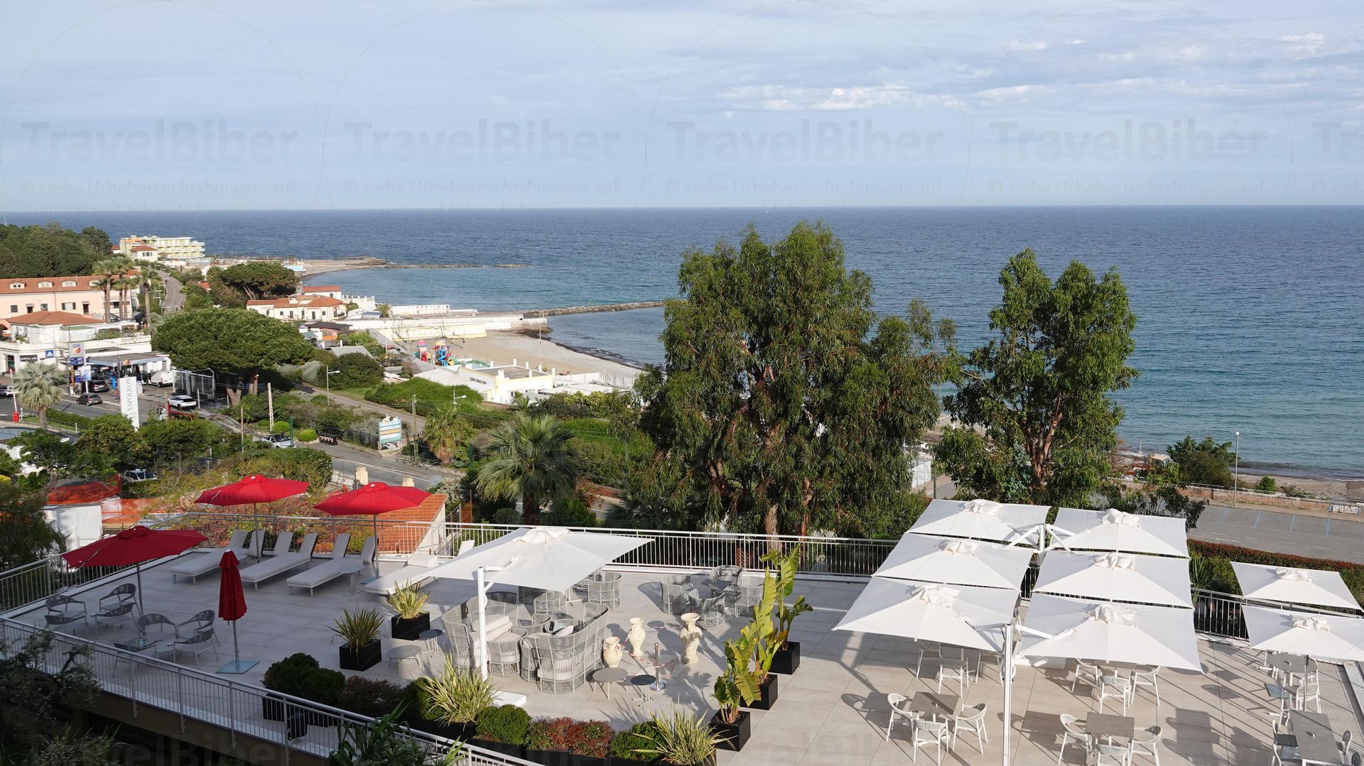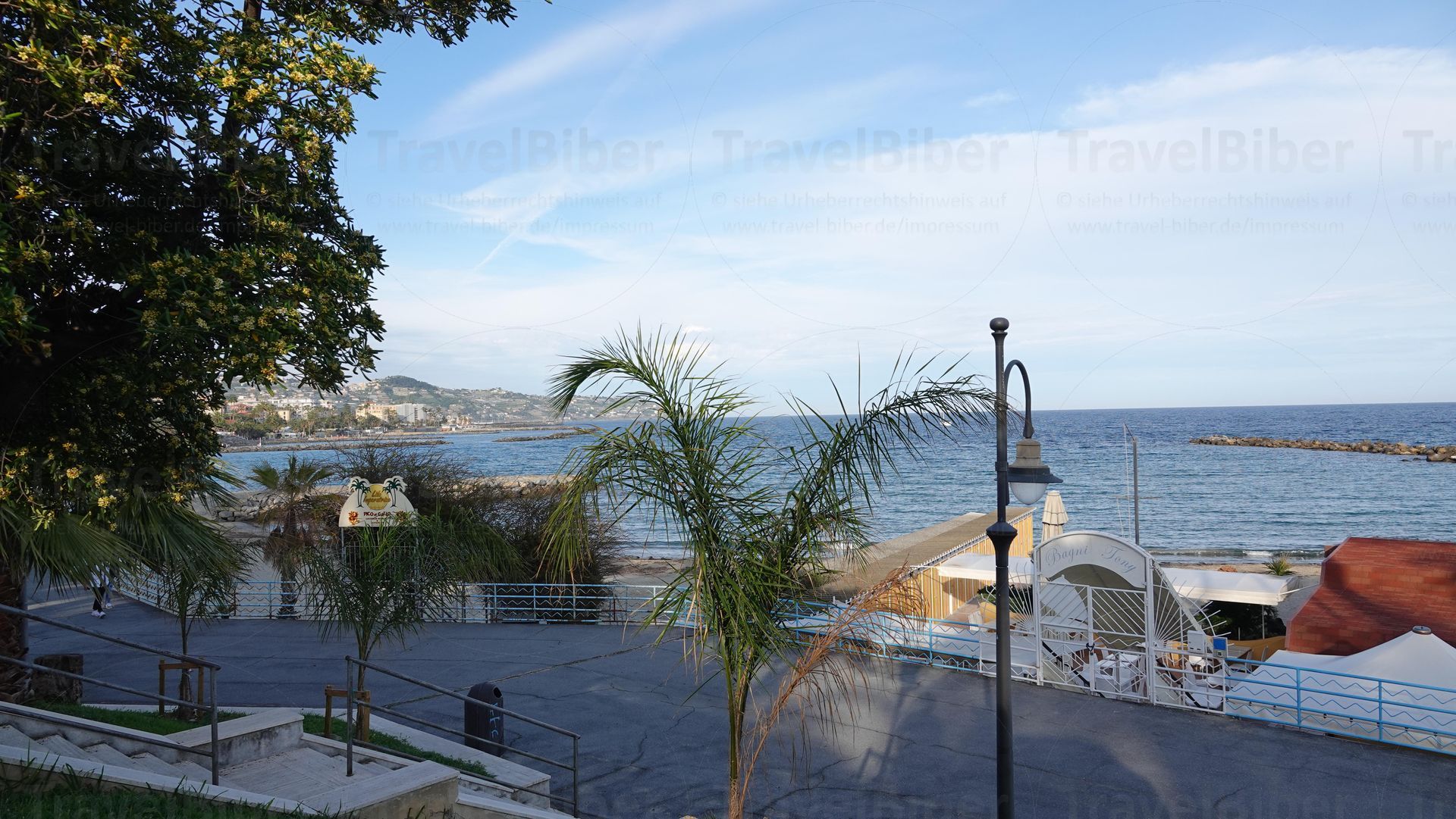 entfernt an der ligurischen Küste. Auf dem Weg nach Sanremo erfolgt hier ein kurzer Stopp am Strand in einer typischen italienischen Strandbar. Heute ist es ein wenig bewölkt und windig.