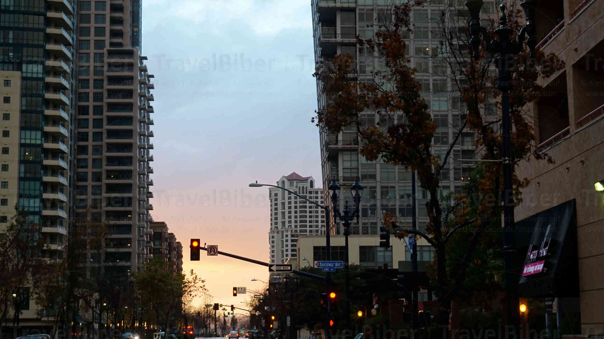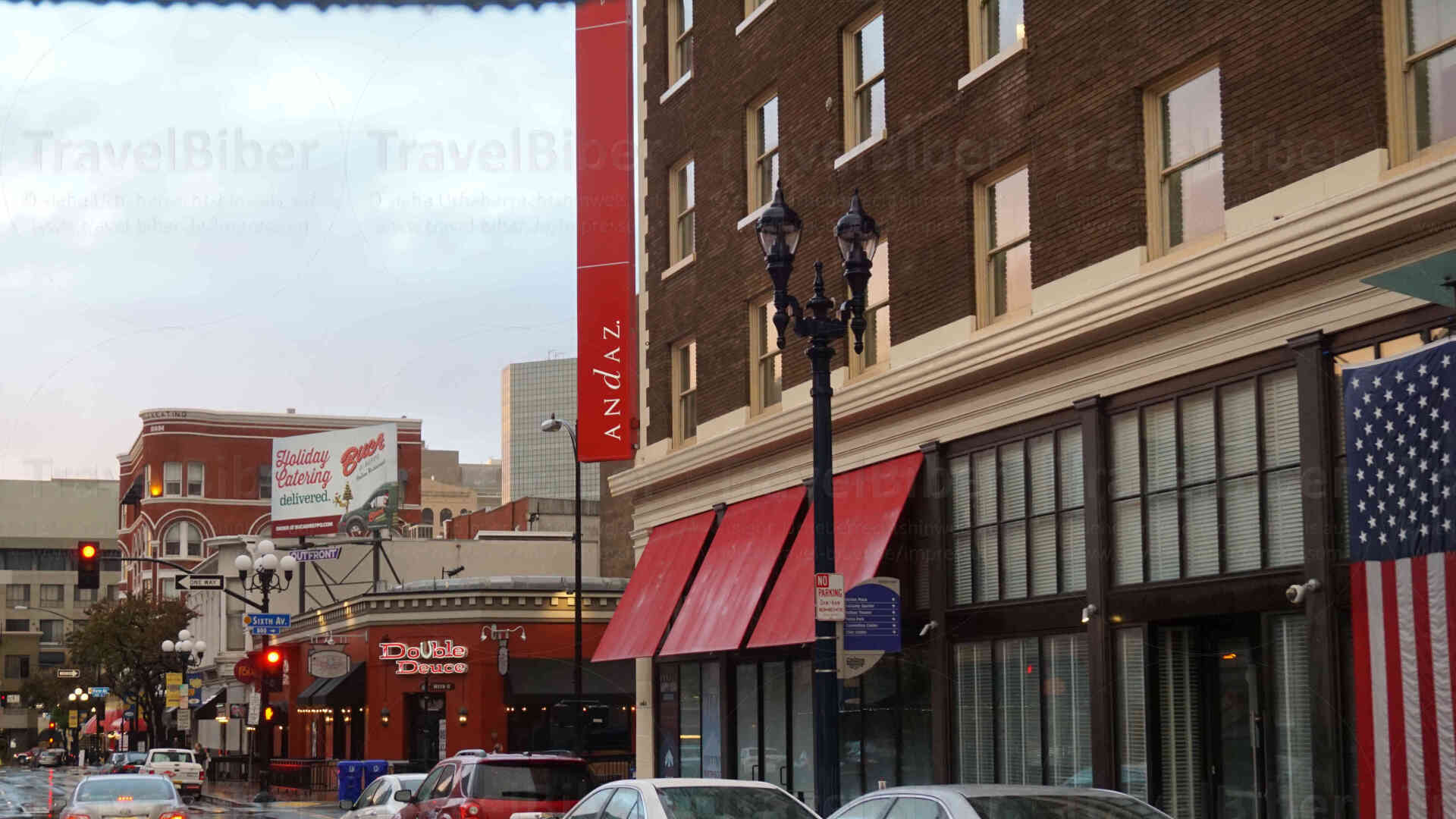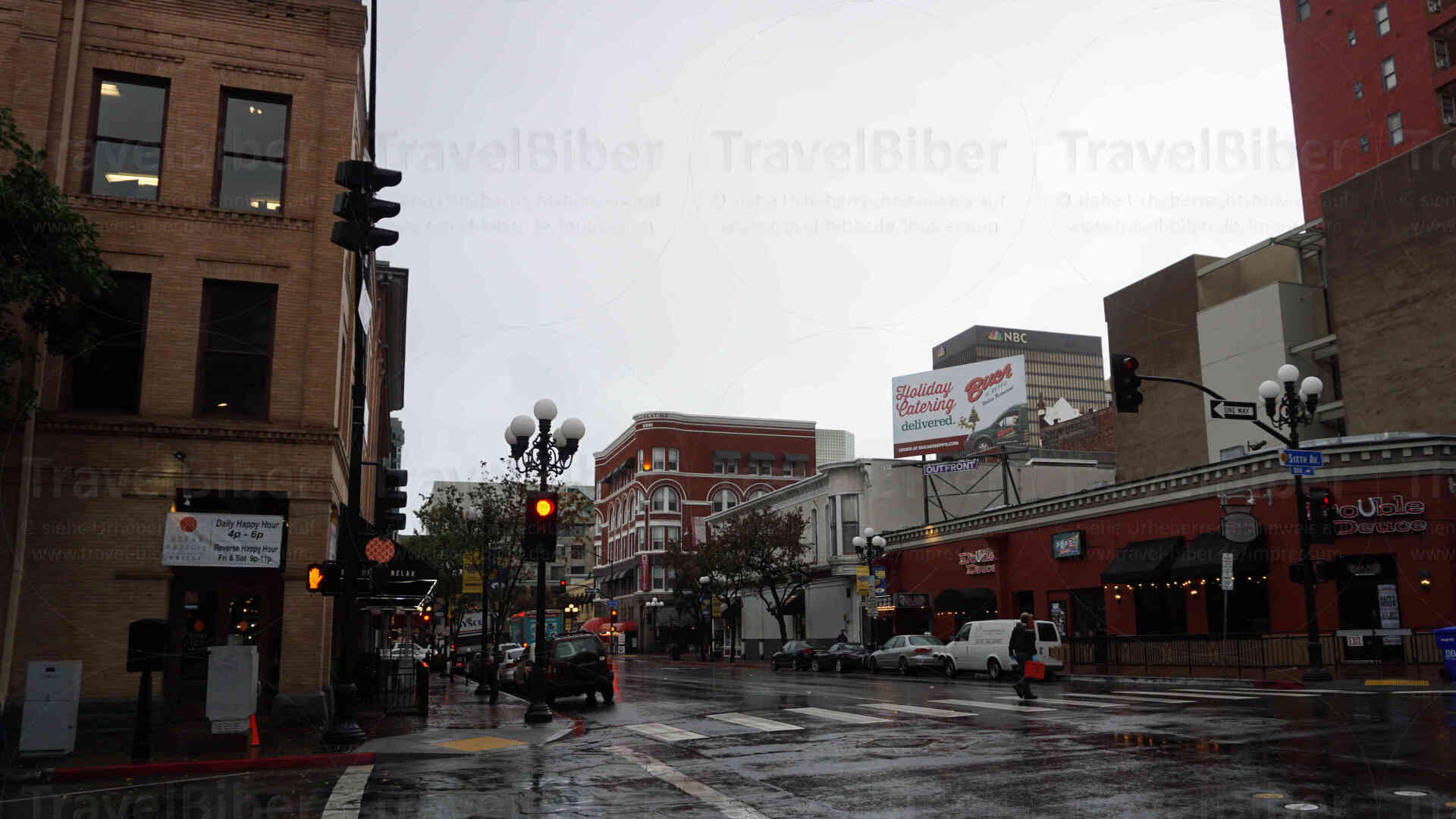Unterwegs im Gaslamp Quarter, dem historischen Kern von San Diego: Man mag es kaum glauben, aber es regnet in der ansonsten sehr sonnigen und trockenen Gegend. Aber es ist Januar und die Menschen dort freuen sich über den Regen, der monatelang auf sich warten hat lassen.