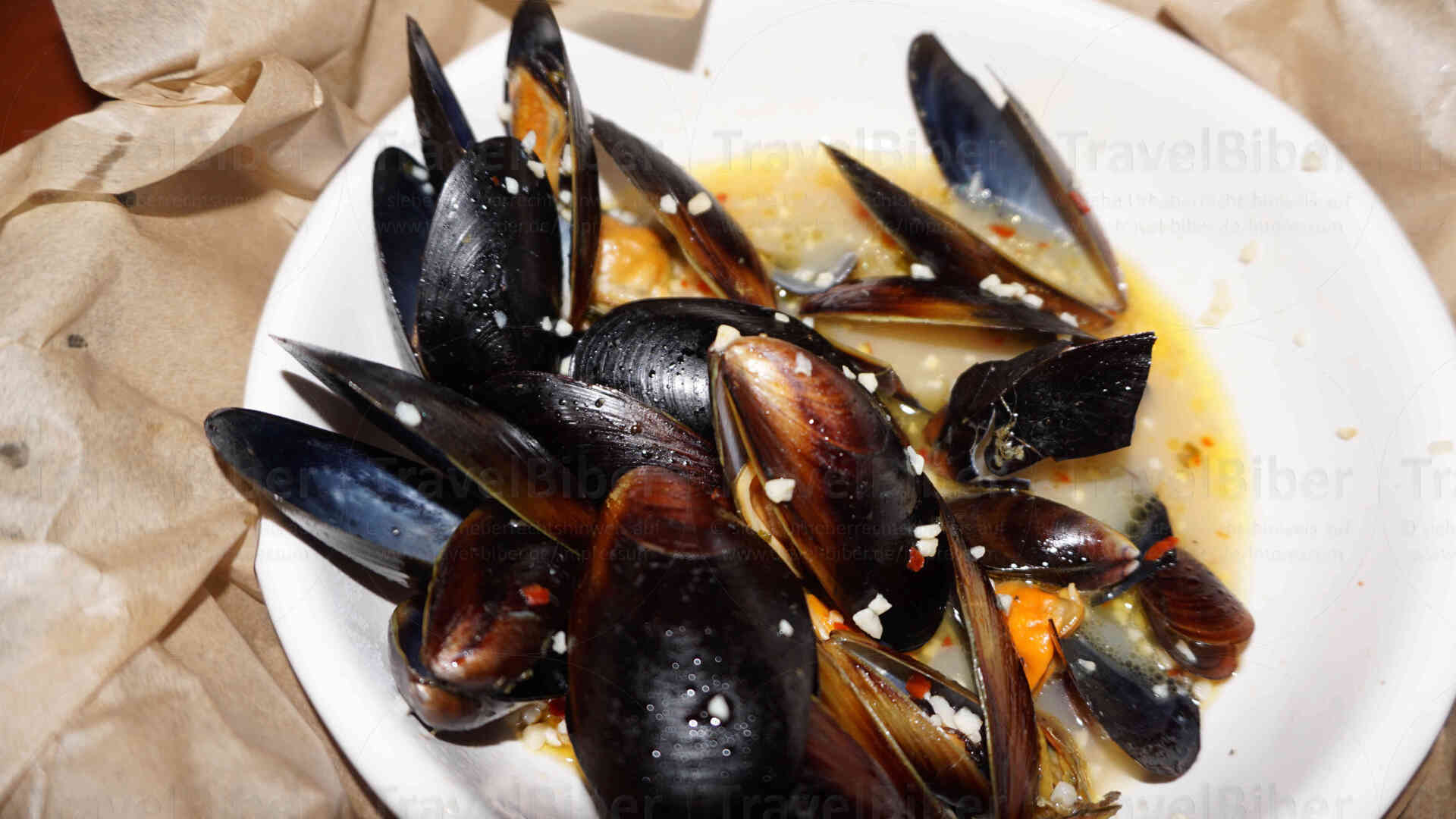 Krabben- und Miesmuschelessen am Hafen von San Diego: Miesmuscheln in Weißweinsauce, als Hauptgang Krabben in verschiedenen Varianten: King Crab, Queen Crab, Snow Crab, auch Languste und Hummer.
