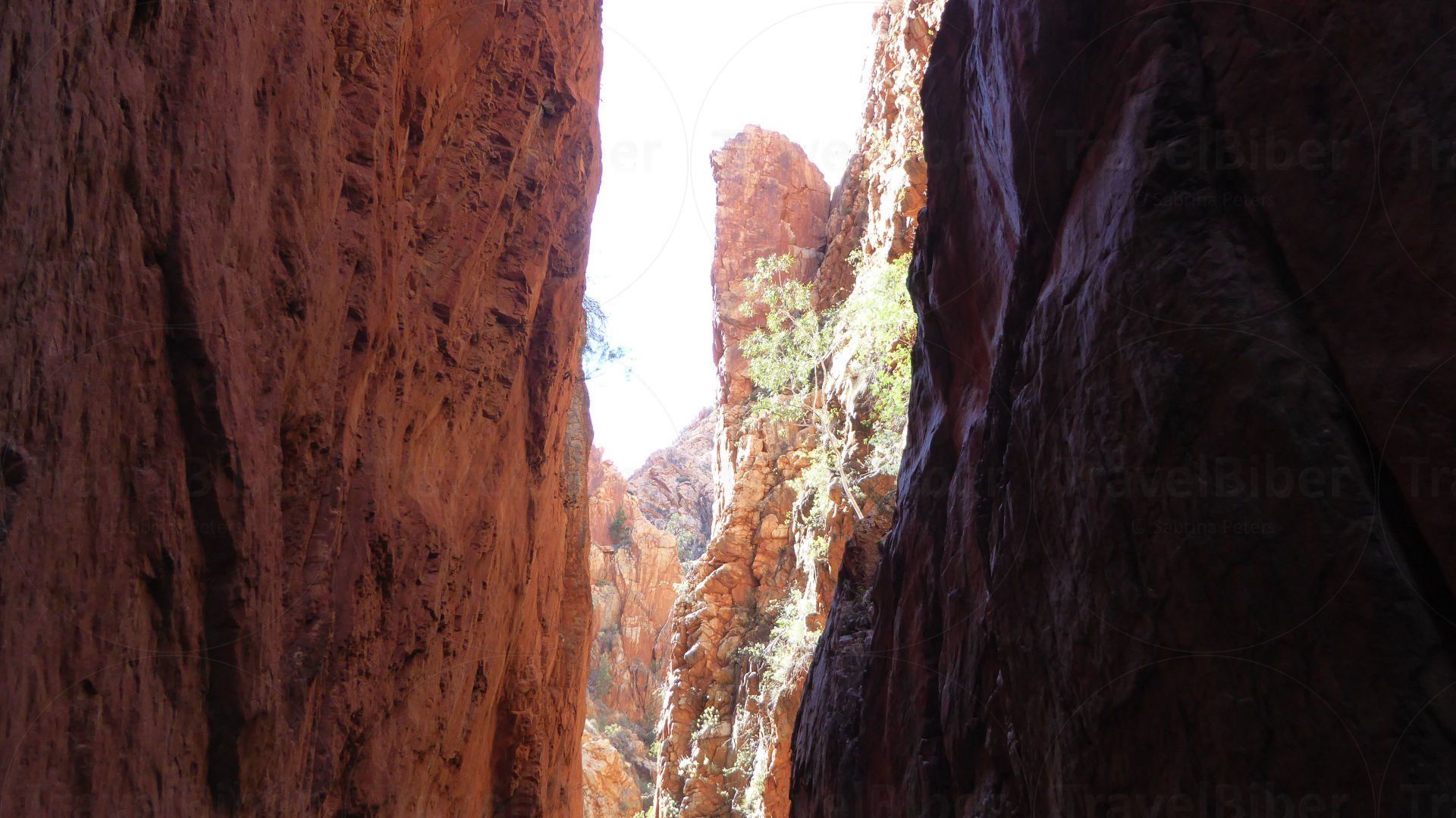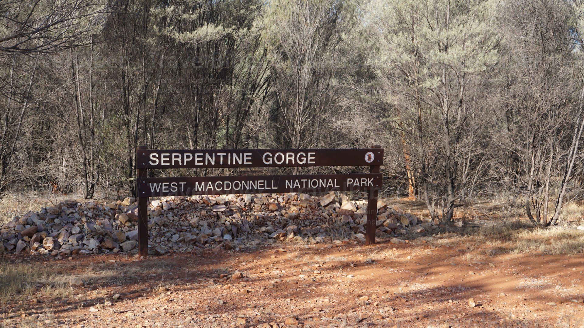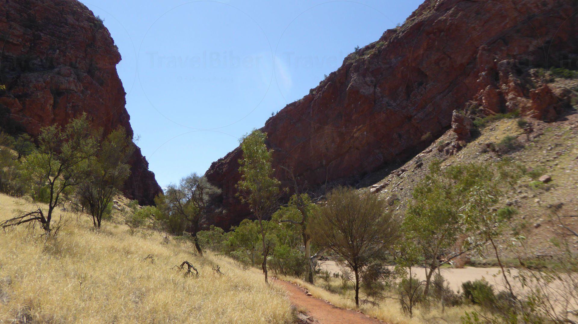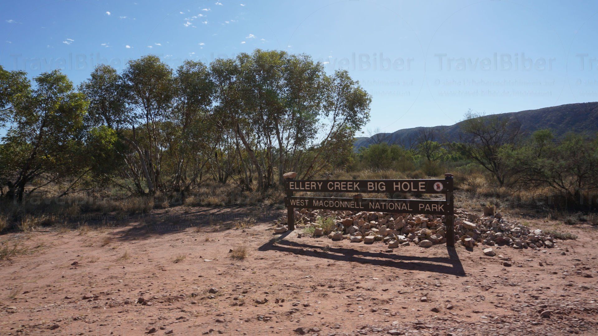Kurz nach dem Nationalparkschild erreicht man ersten Abzweig von der Hauptstraße. Die Abzweigung führte zu Simpsons Gap, einer engen Felsschlucht mit vielen Ghost Gums, Geister-Eukalypten, und angeblich auch Rock-Wallabys.