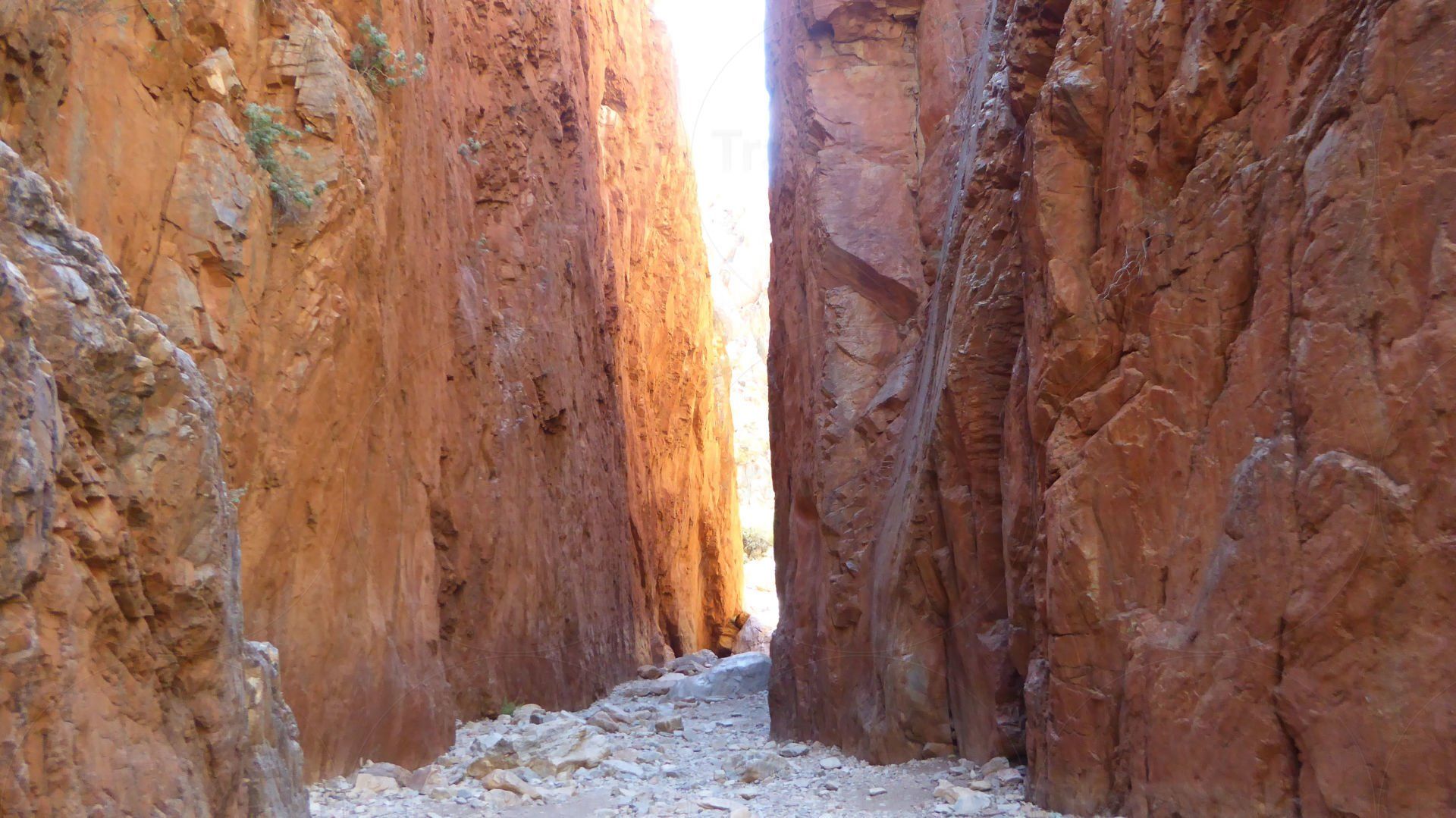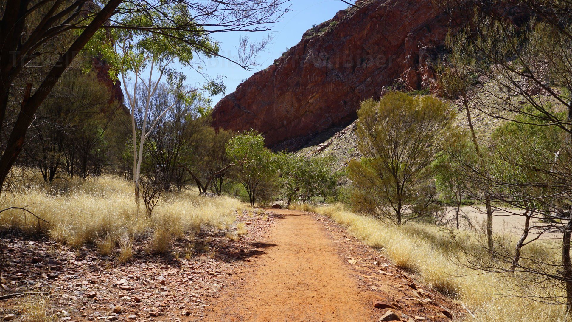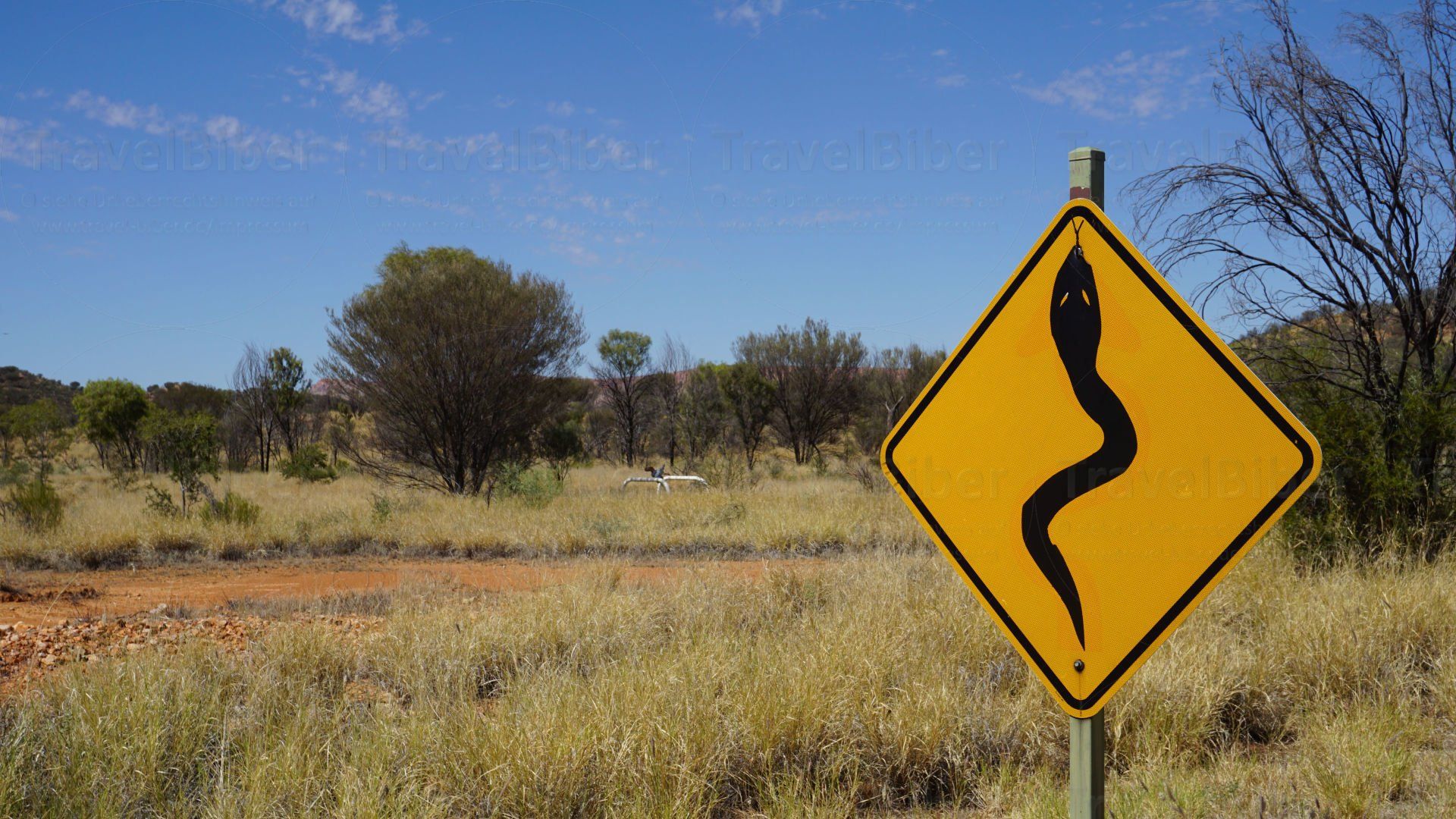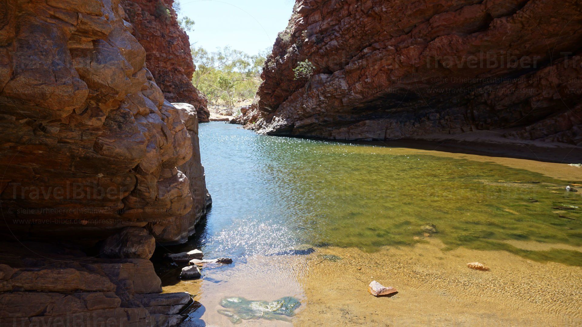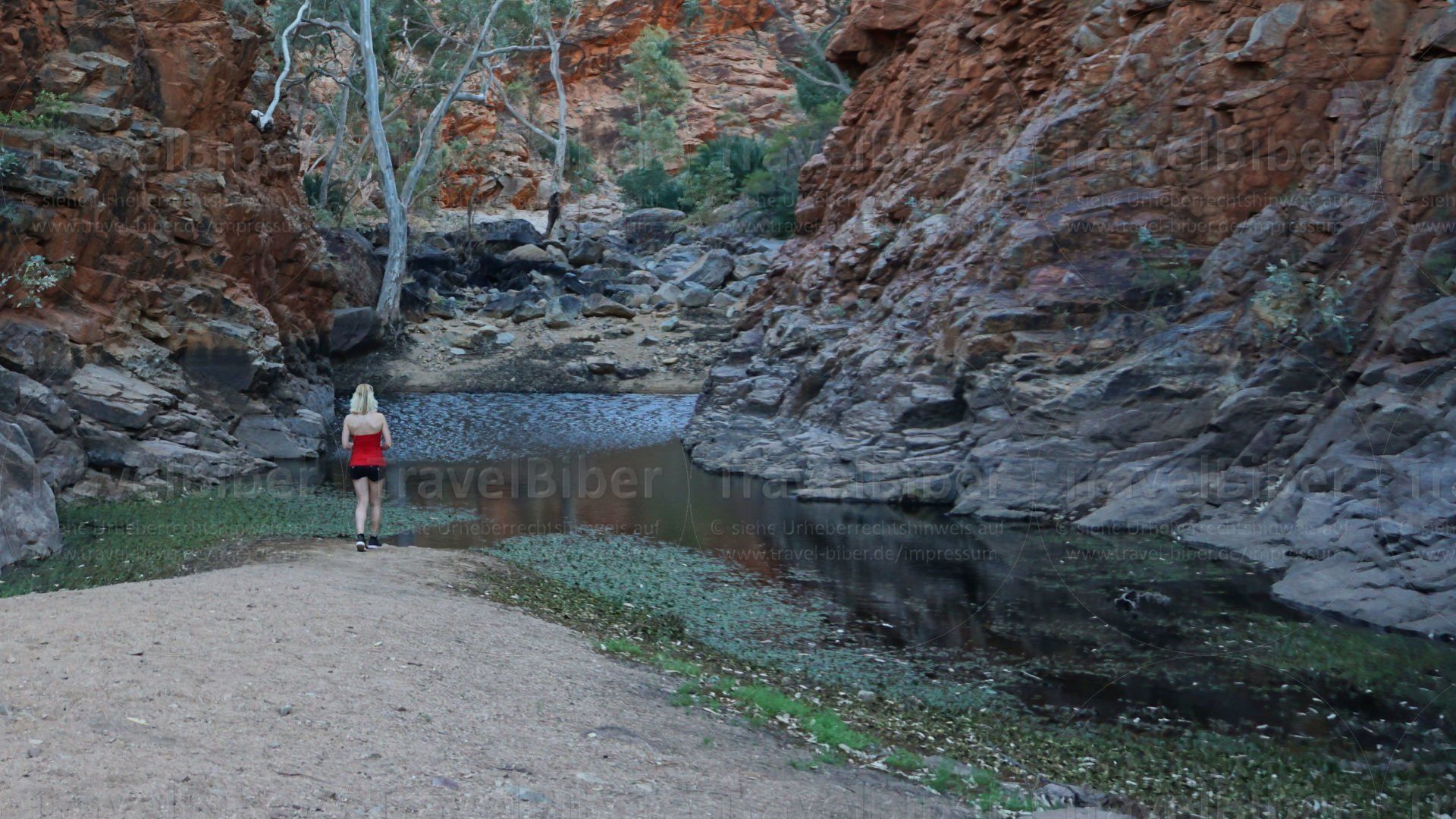 Kurz nach dem Nationalparkschild erreicht man ersten Abzweig von der Hauptstraße. Die Abzweigung führte zu Simpsons Gap, einer engen Felsschlucht mit vielen Ghost Gums, Geister-Eukalypten, und angeblich auch Rock-Wallabys.