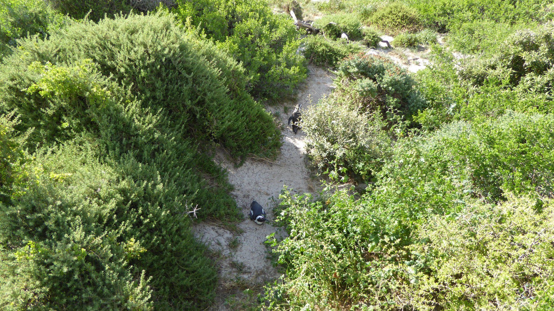 Da laufen sie, entlang eines Sandpfades zwischen den Büschen, die Pinguine.