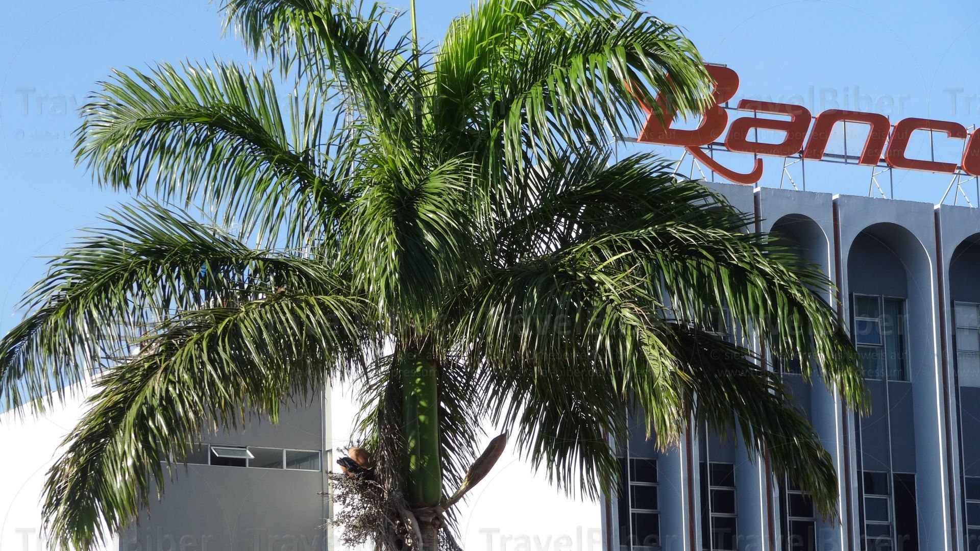 Blick auf die Bank von Costa Rica mit wunderhübscher hoher Palme direkt davor.