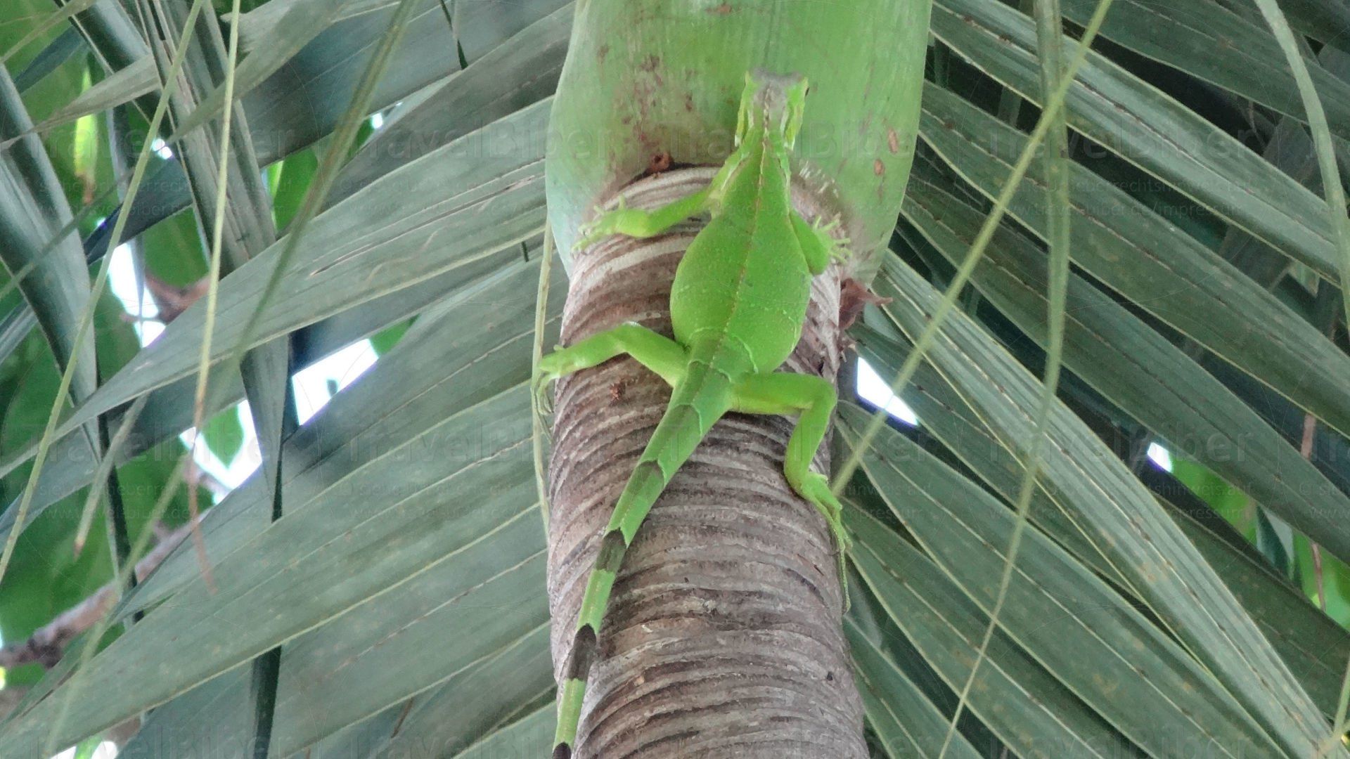 Ein wunderschöner grüner Leguan an einer Palme