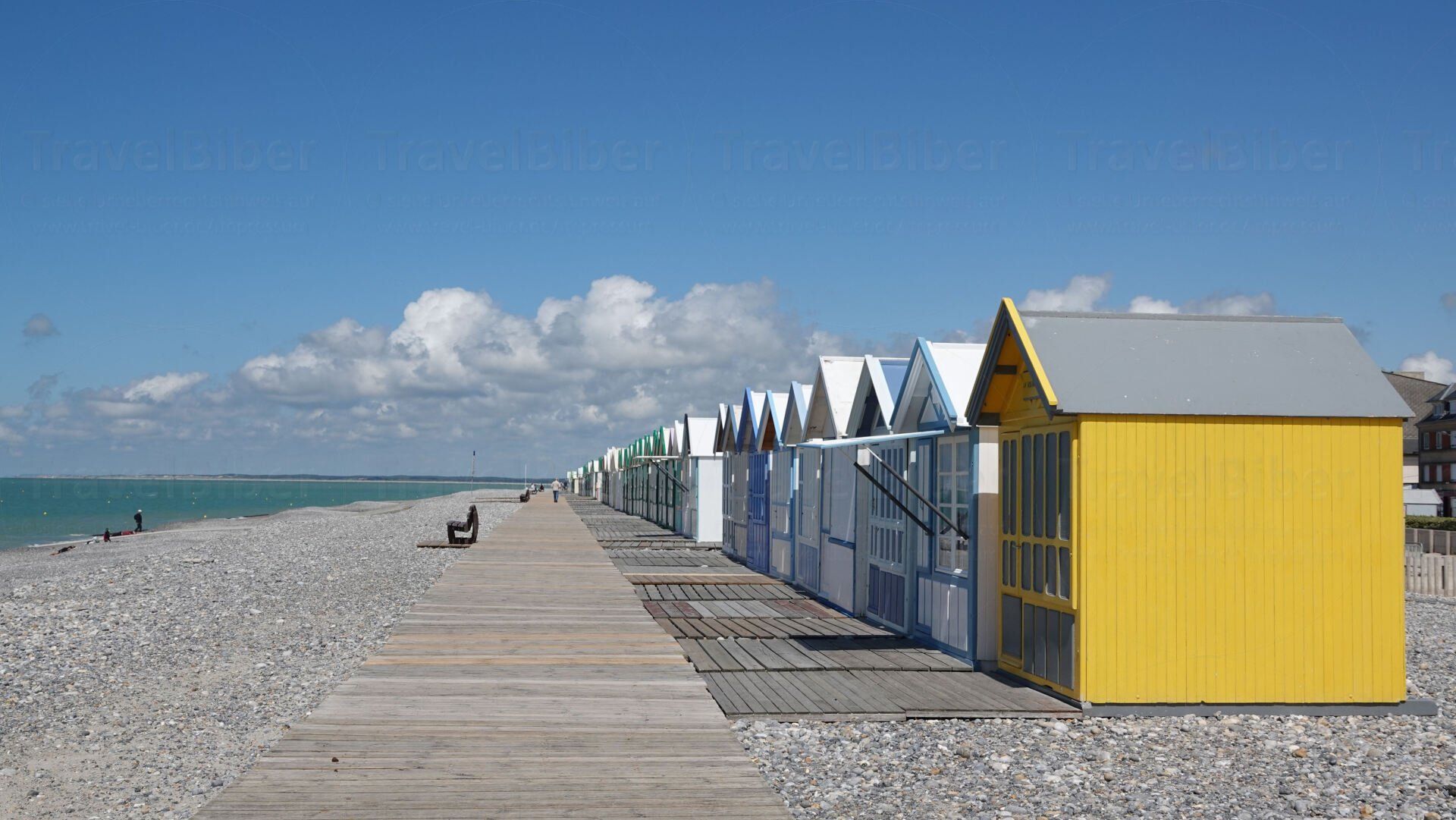 Bunte Badehäuschen und Kiesstrand in Cayeux-sur-Mer.