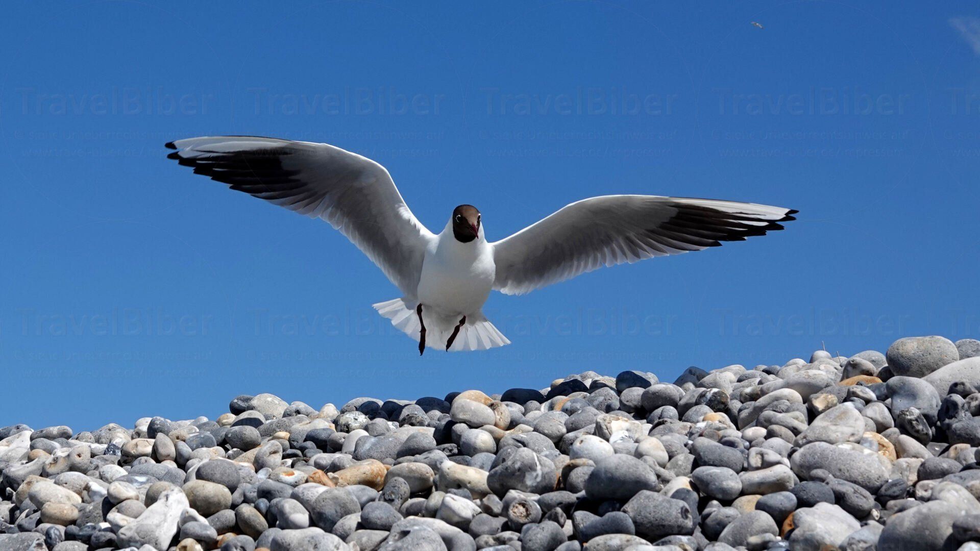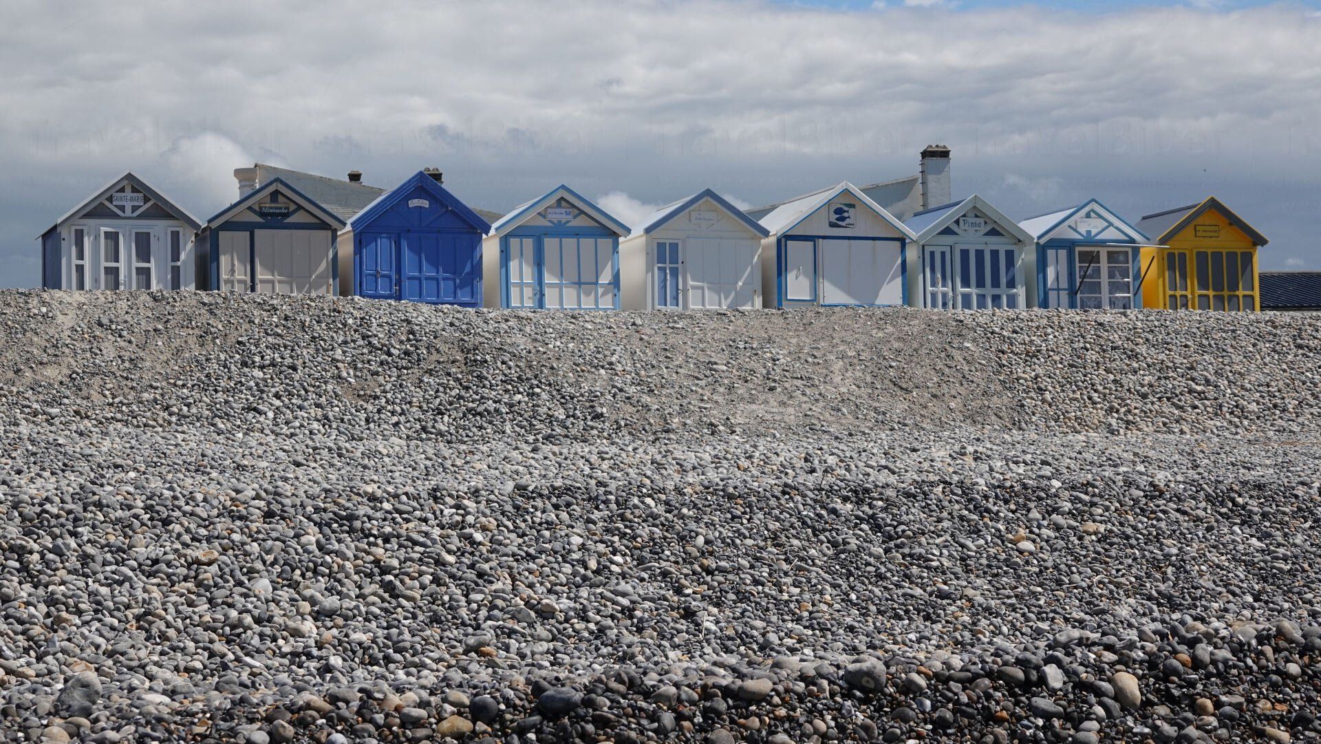 Nochmal die hübschen Badehäuschen, in allen Farben vor dem aufgetürmten Kies des Badestrandes.
