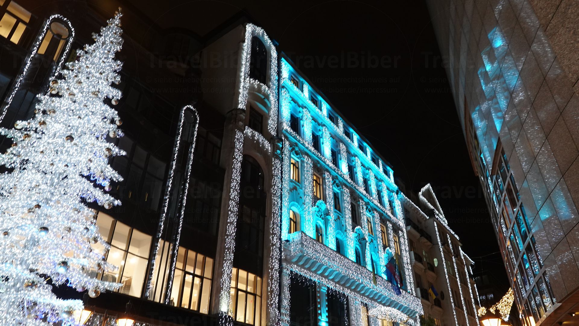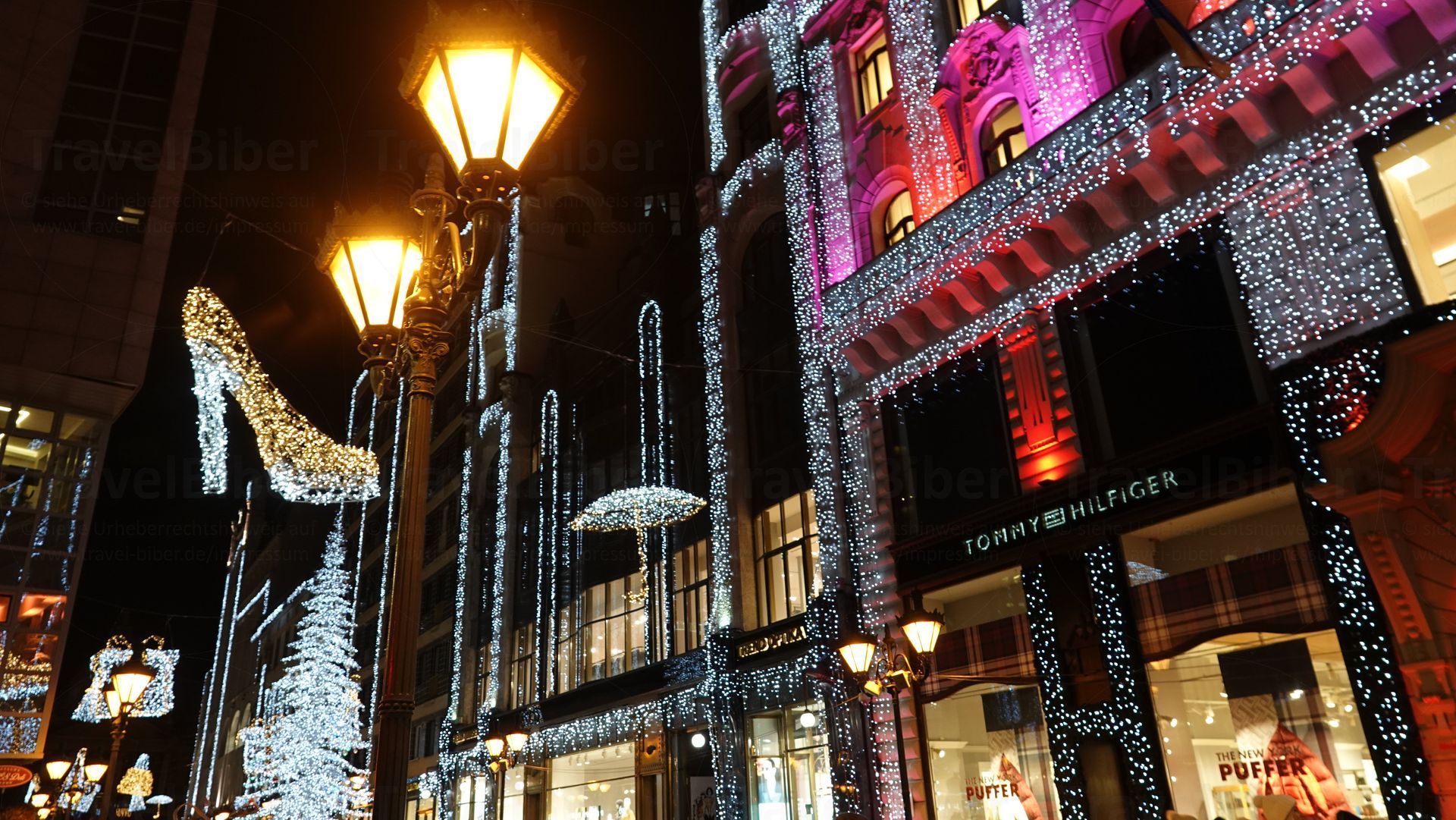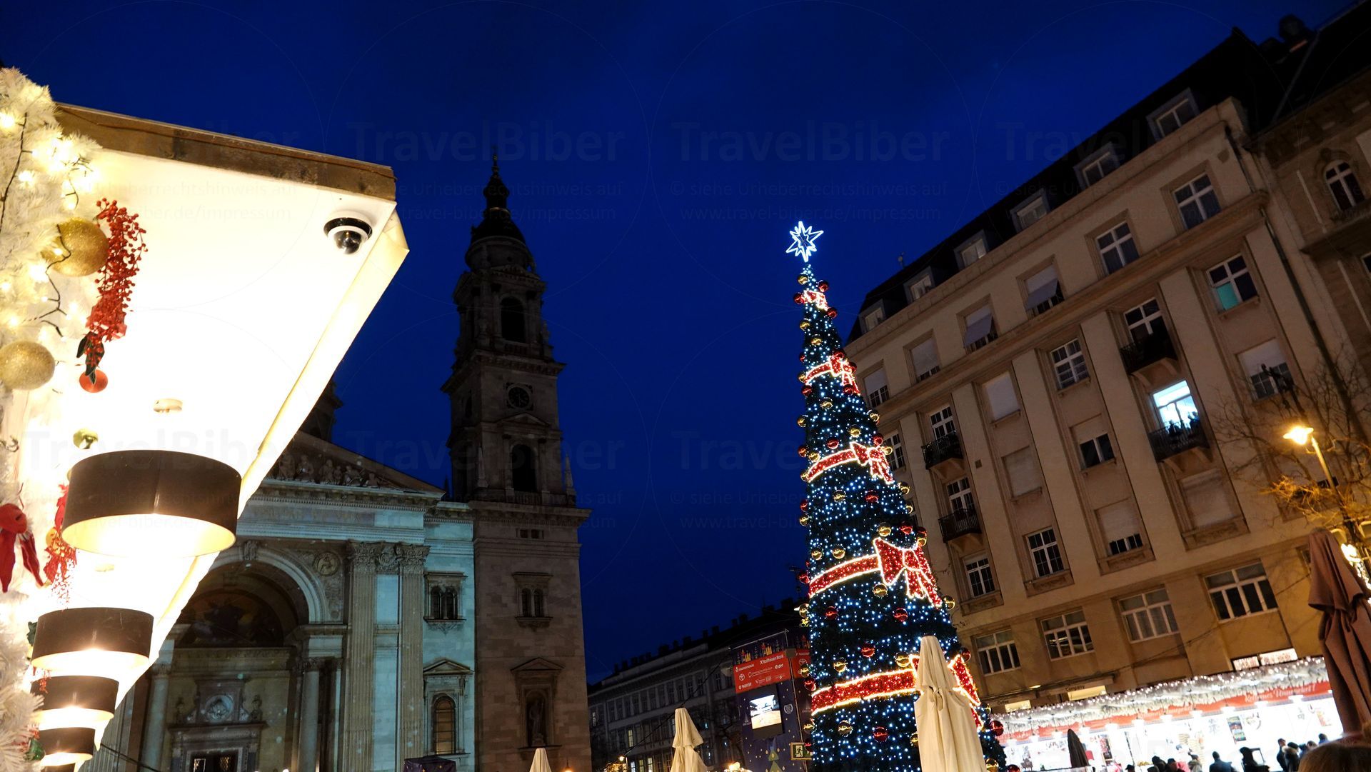 Diese weihnachtlich geschmückte Straße liegt kurz vor der St.-Stephans-Basilika, vor der sich auch ein Weihnachtsmarkt befindet.