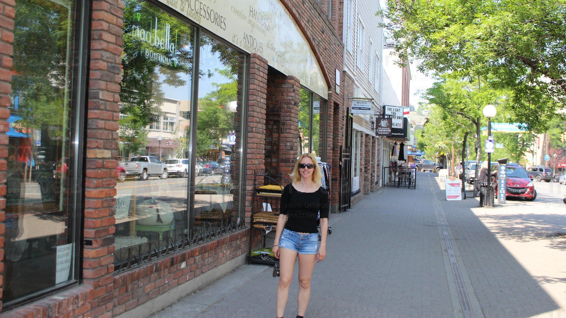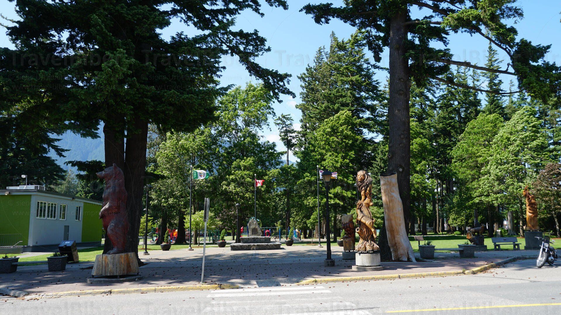 ist eine Kleinstadt in British Columbia. Am Straßenrand aus Holz geschnitte Figuren.