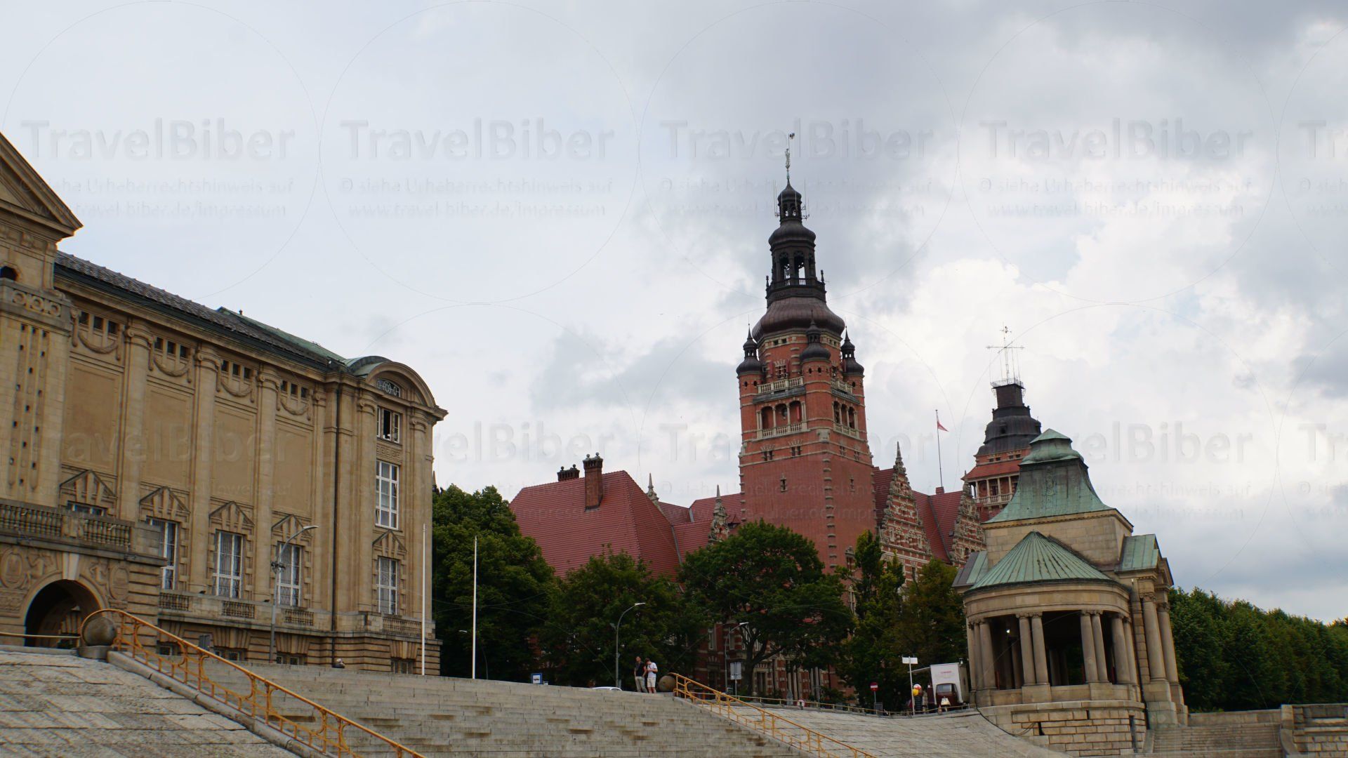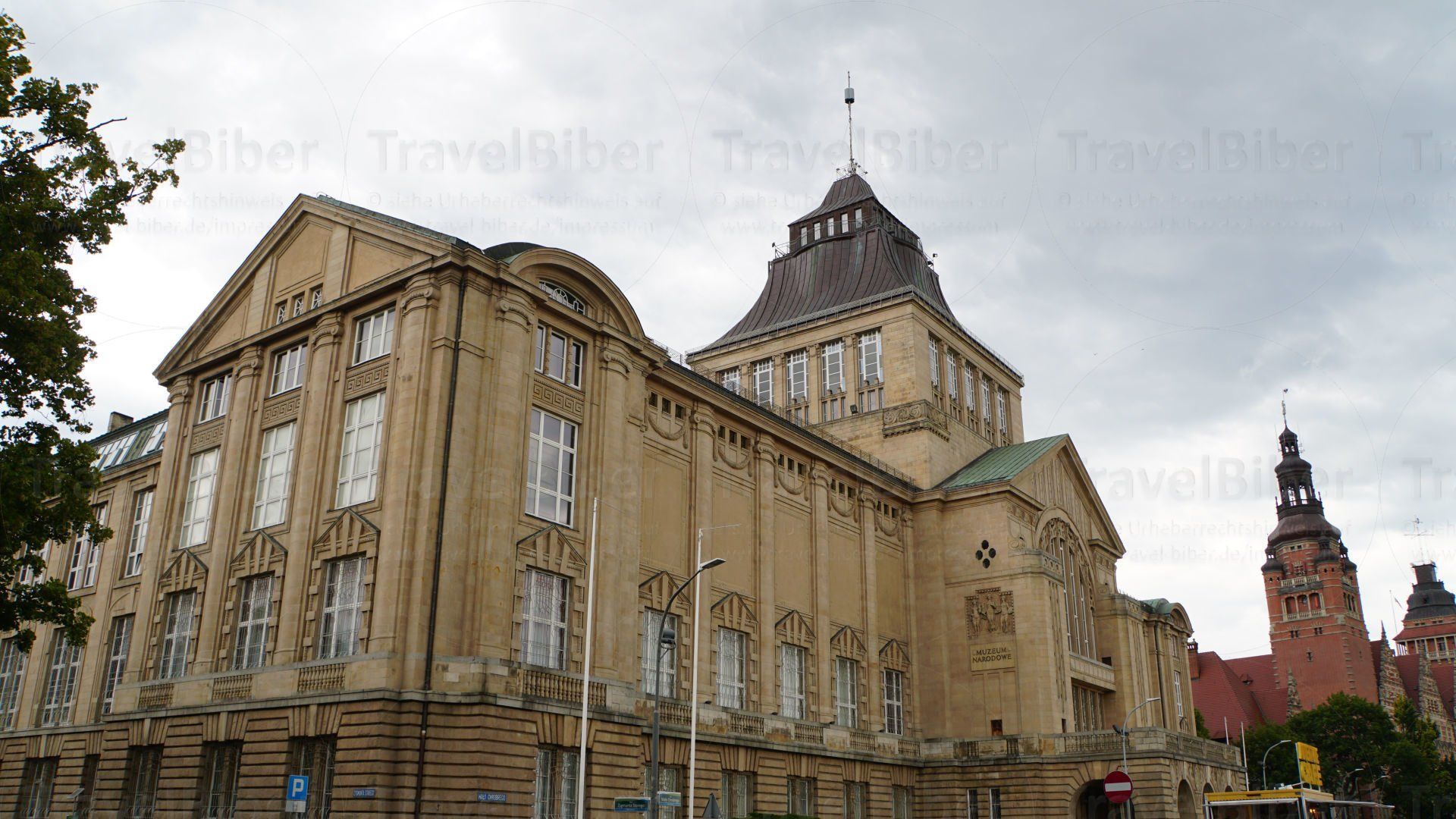 gelegen. Dahinter liegt das Nationalmuseum. Das rote Gebäude daneben ist das Woiwodschaftsamt Westpommerns.
