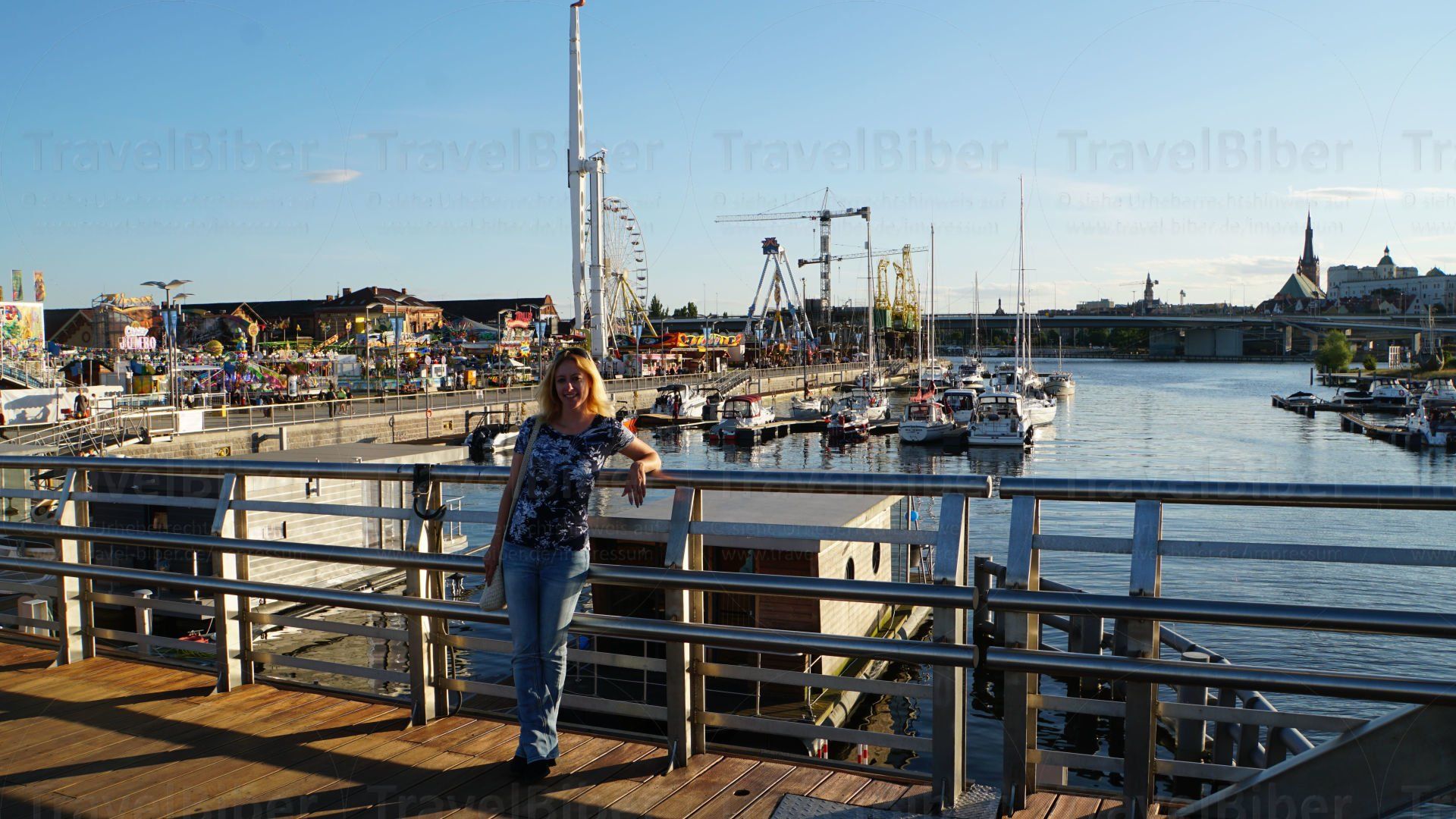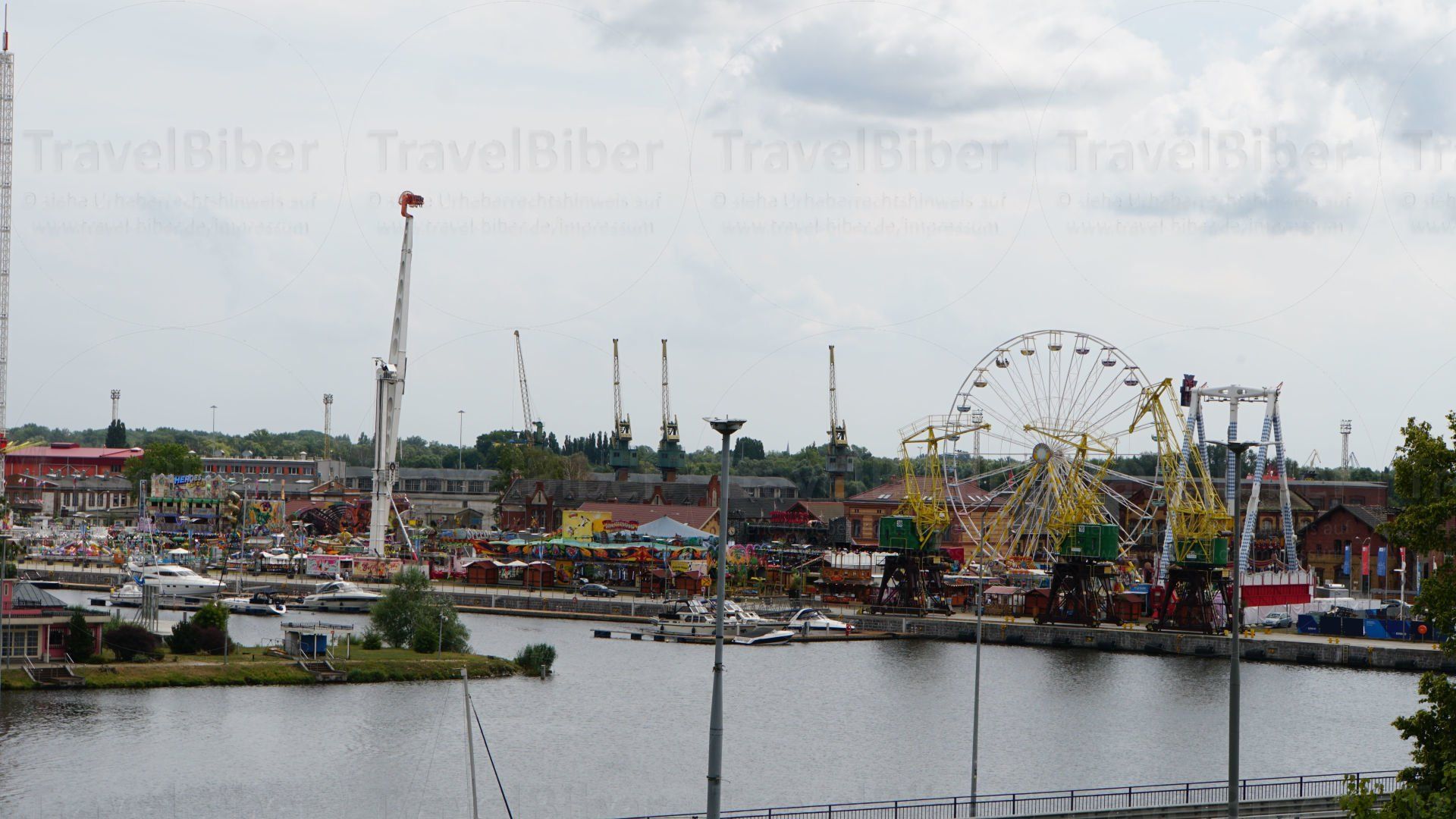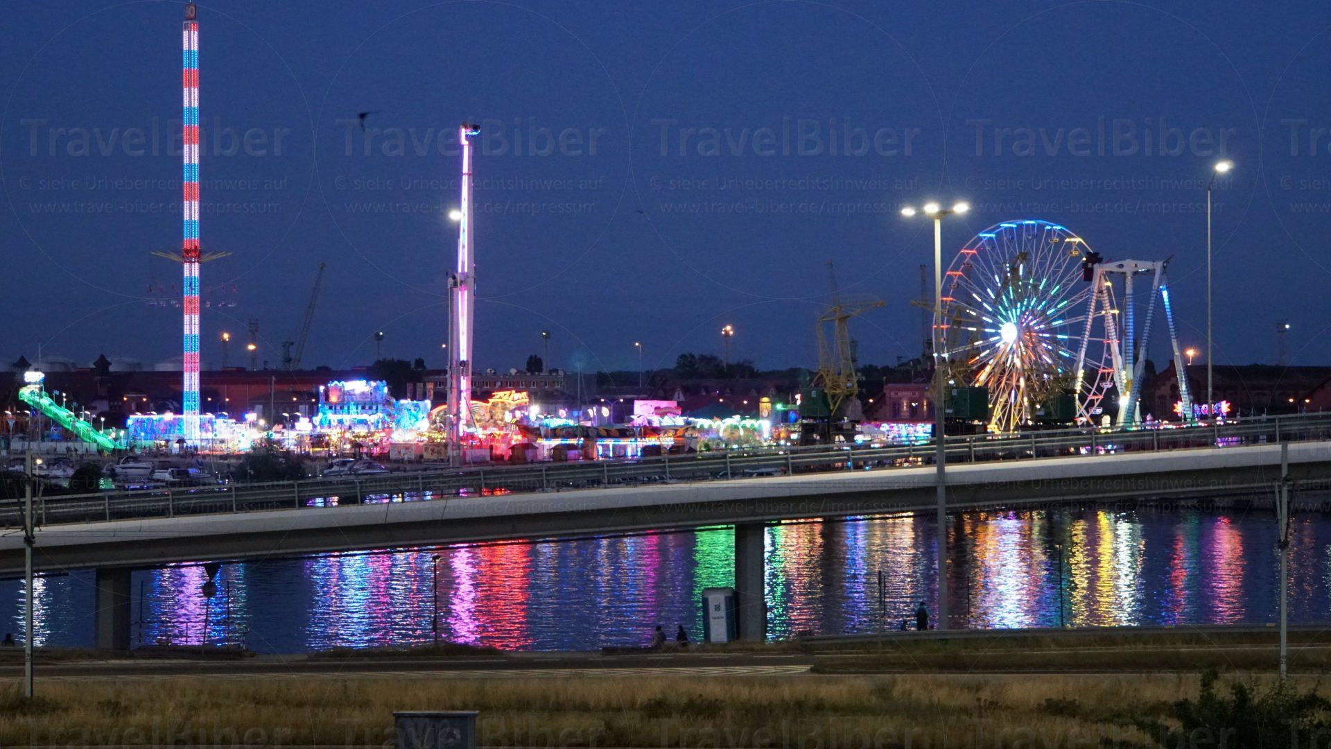 Blick auf den Rummelplatz auf der anderen Seite des Flusses auf dem Hafengelände.