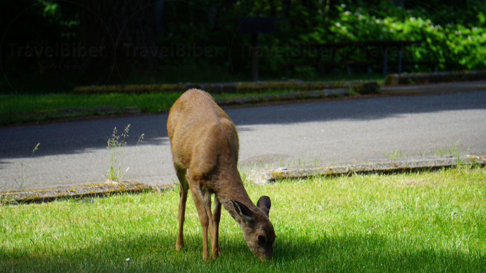 Dieser Hirsch grast seelenruhig direkt vor dem Truck-Camper im Fort Casey State Park, lässt sich nicht stören.