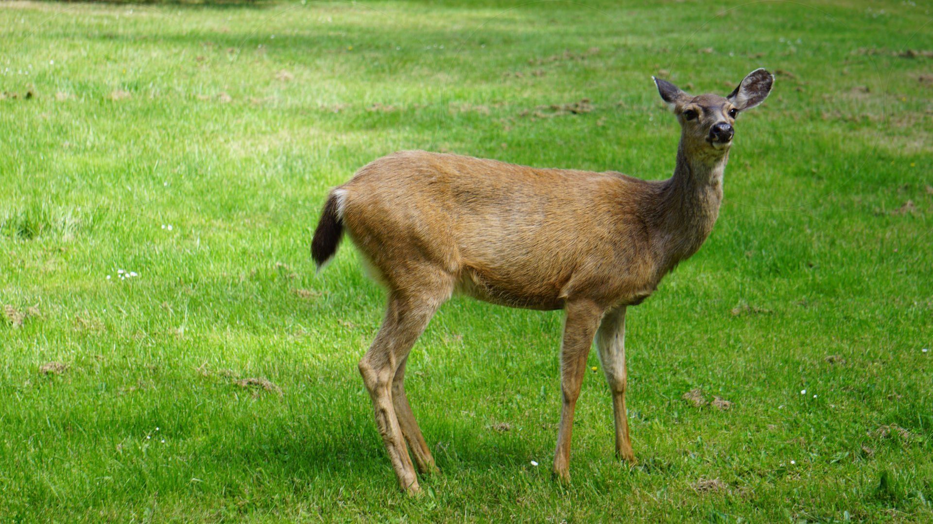 Grasende Hirsche in einem Wohngebiet an der Chuckanut Bay.