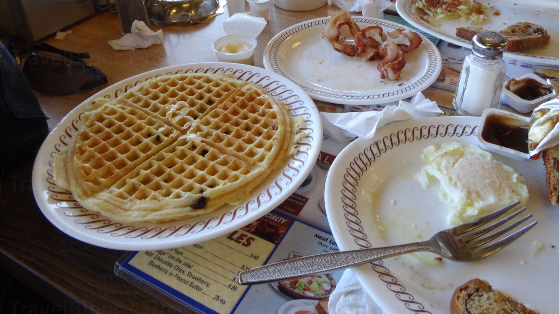 Amerikanisches Frühstück genießen: Eine Frau mit blauer Schürze und Schildkappe nimmt die Bestellung auf: Zuerst stellt sie einen großen Becher Kaffee auf den Tisch, mit amerikanischen Flagge drauf. Dann folgt ein Menu, so reichhaltig wie es wahrscheinlich auch nur in Amerika sein kann. Auf meinem Teller liegen mehrere süße Toastscheiben mit Rosinen, dazu Rührei, gebratene Röstkartoffeln (hash brown potatoes) und Speck (bacon). Dazu noch extra Butter und extra Sirup, außerdem eine Blueberry-Waffel. Wie in amerikanischen Filmen wird immer wieder Kaffee nachgeschenkt aus einer gläsernen runden Kaffeekanne. Einfach mmh.