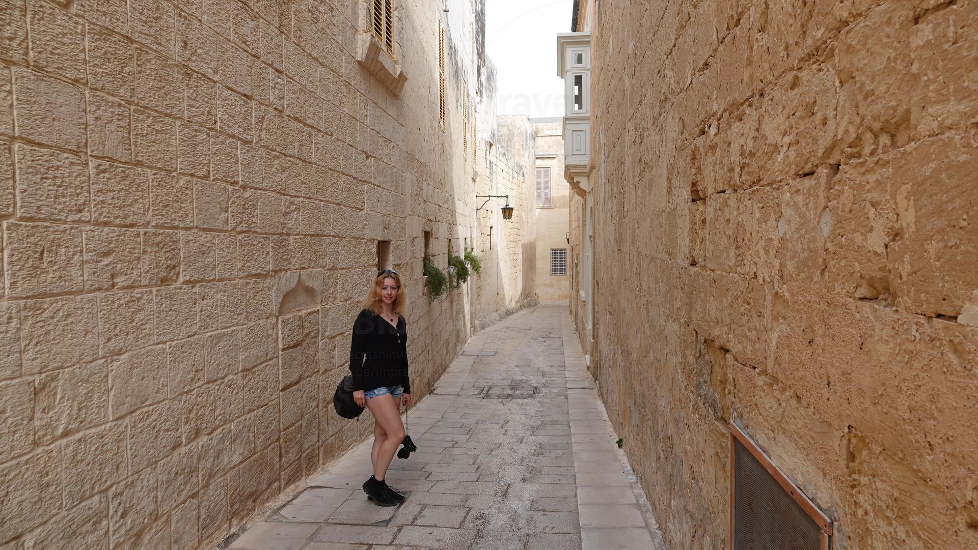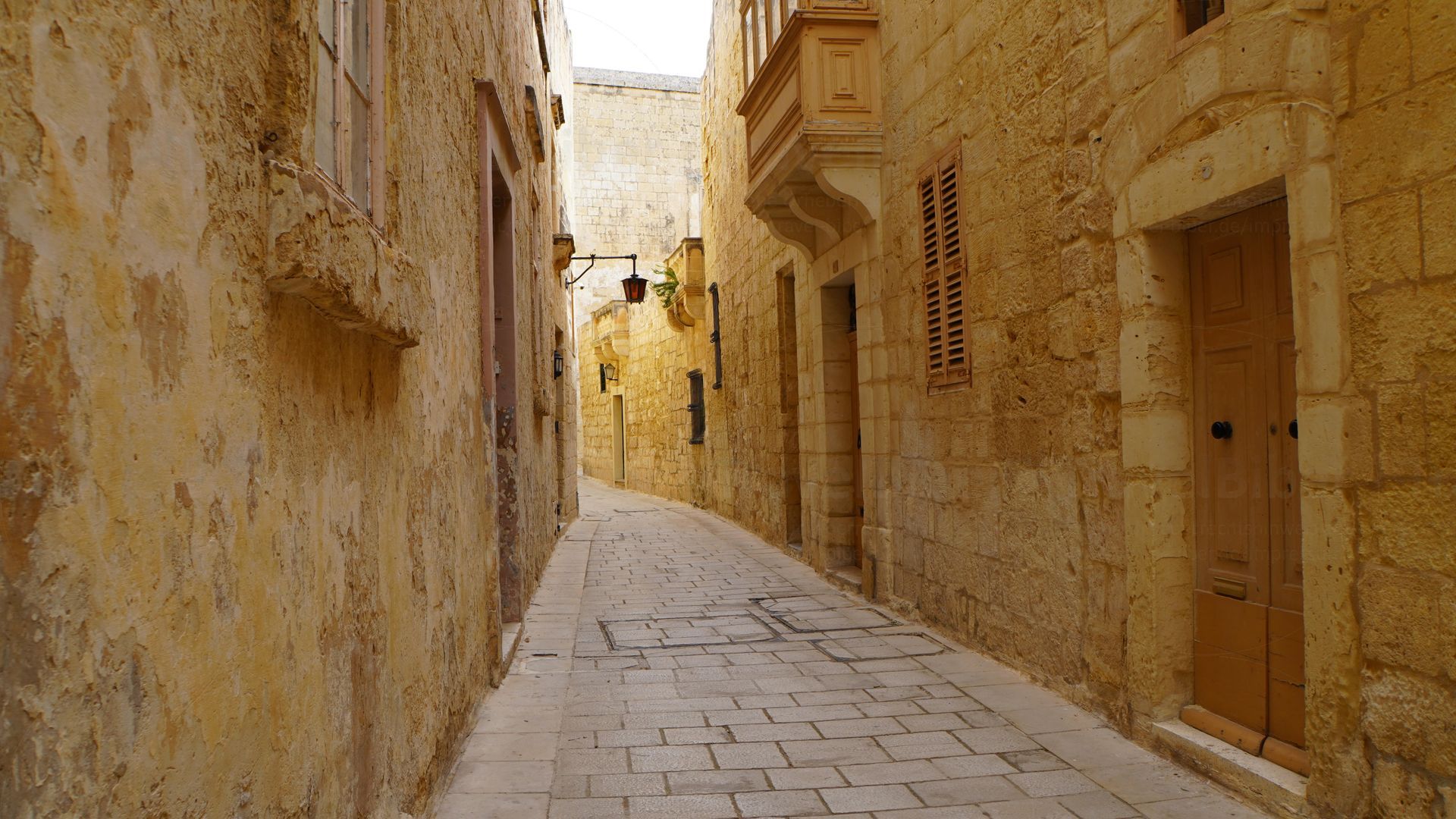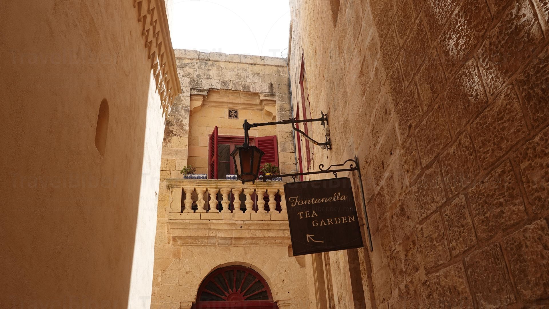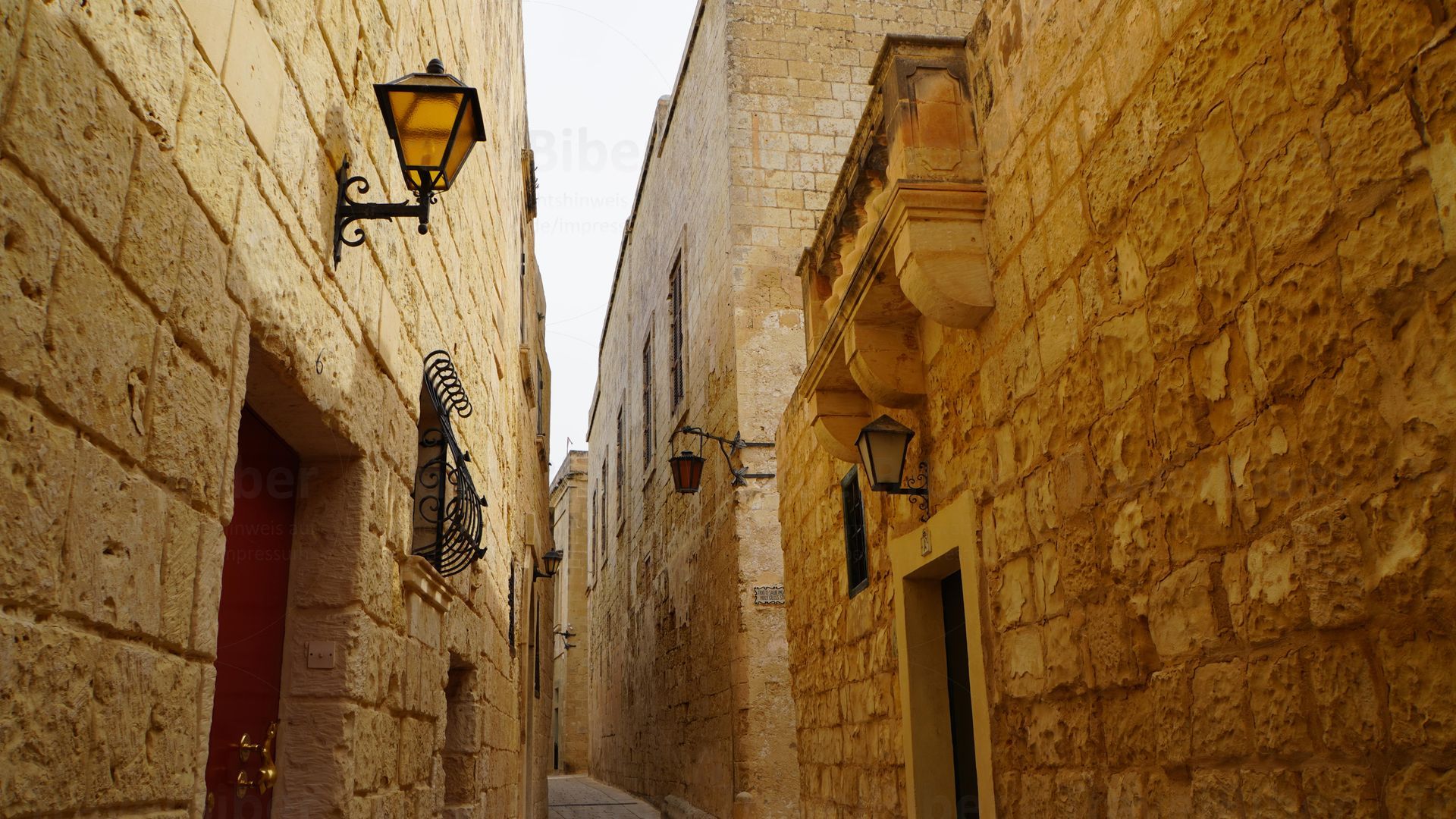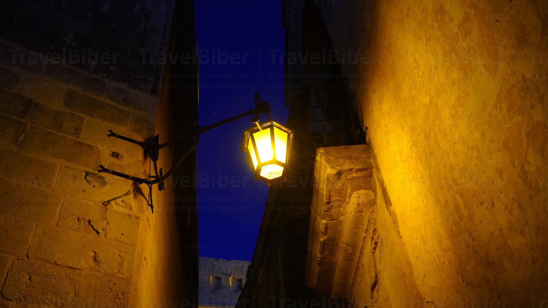 in die Gasse hinein scheinende Sonne lässt die Mauern noch gelber wirken.