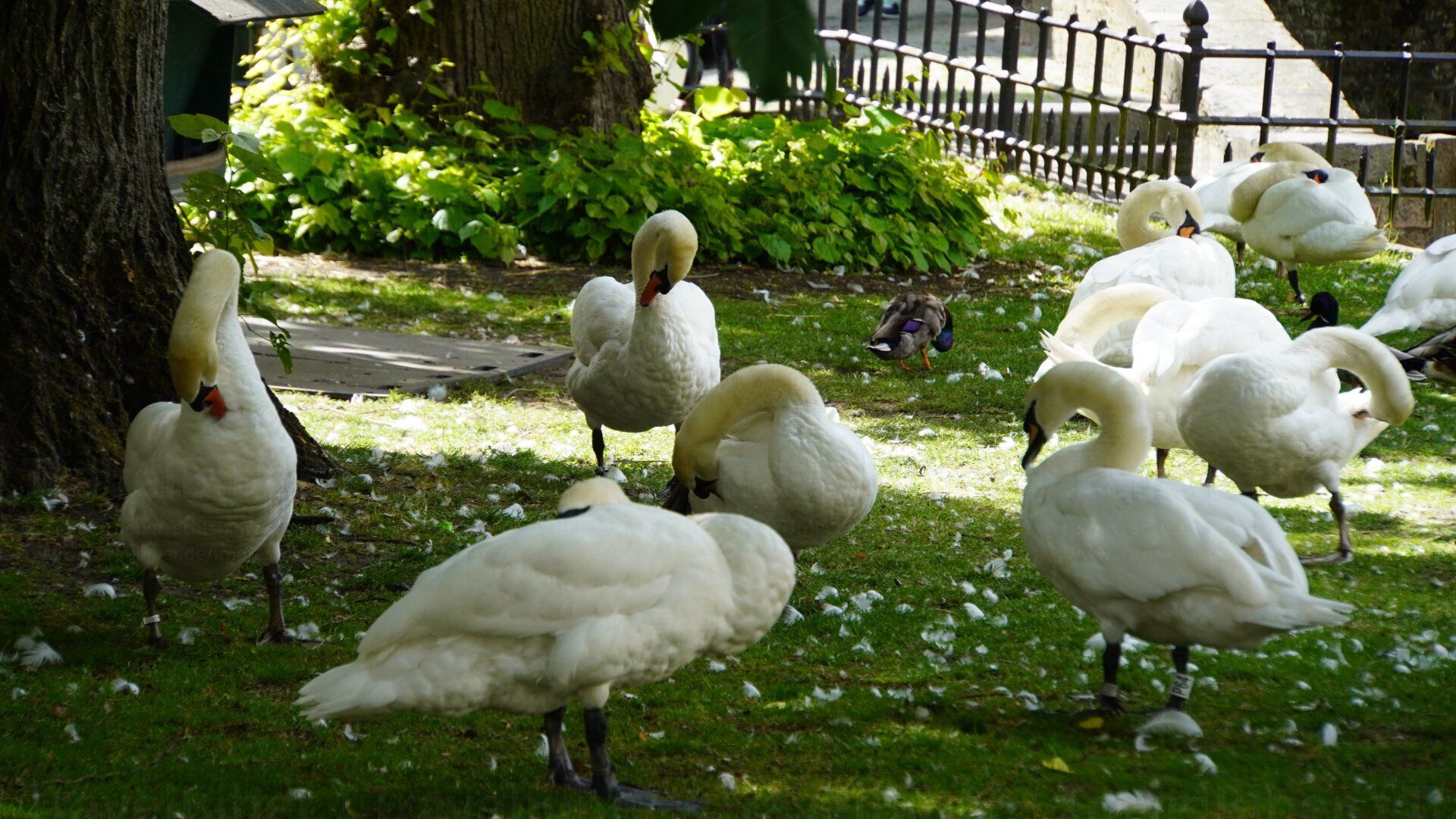 und Teil der mittelalterlichen Festungsanlage mit vielen weißen Schwänen am und im Wasser.