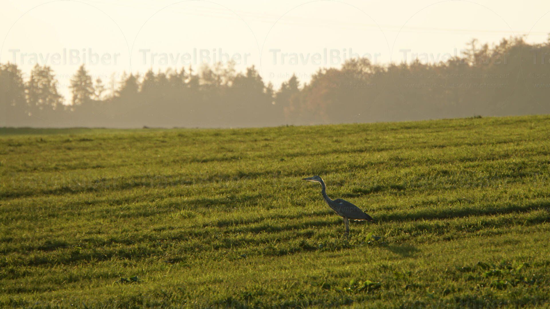 Ein Graureiher auf der Jagd, auf einer Wiese zwischen Mittelbiberach