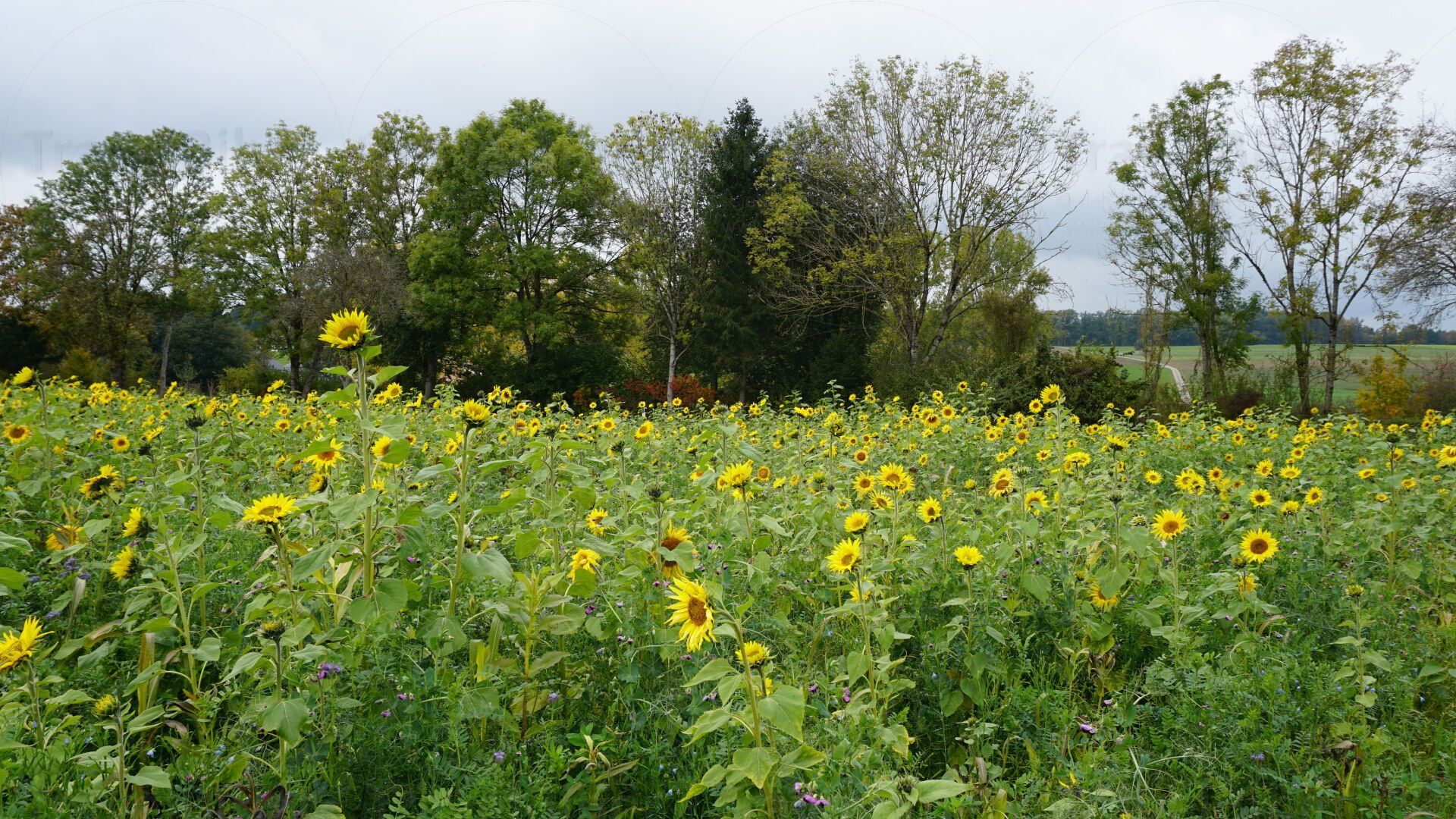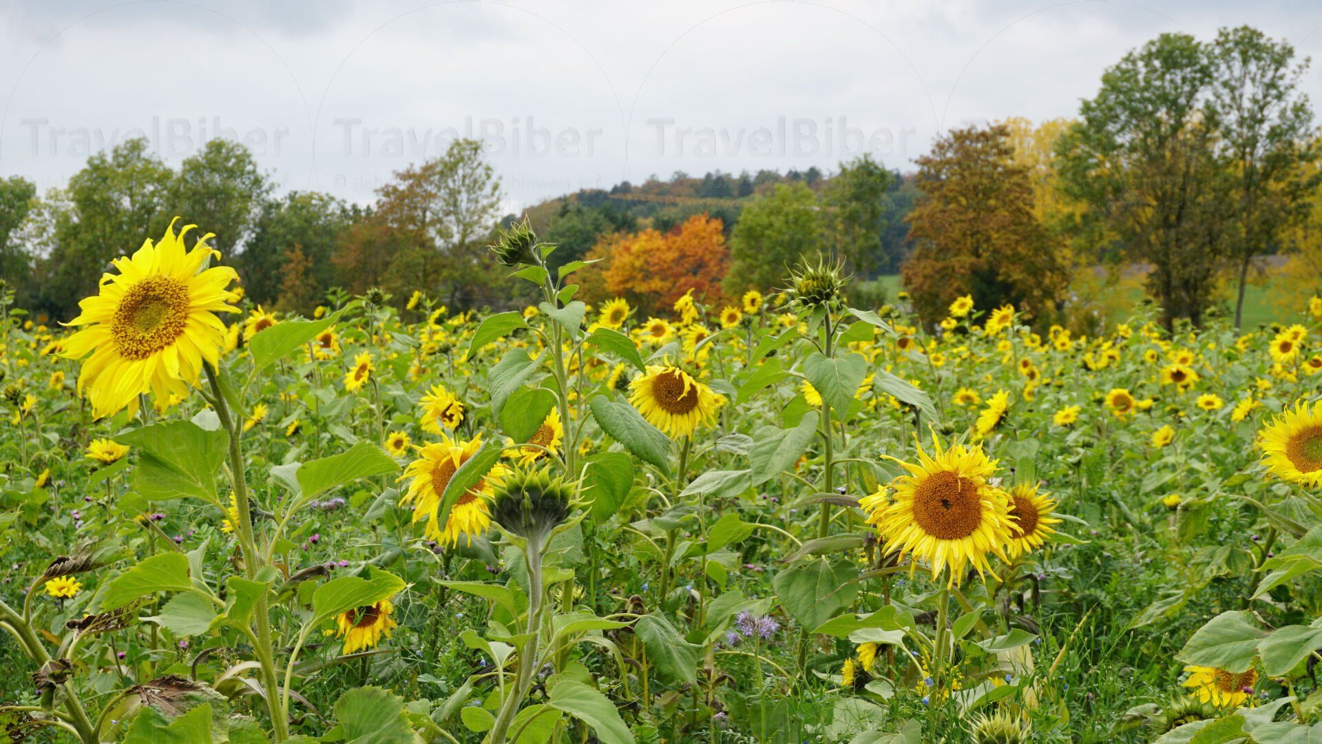 Sonnenblumenfeld und herbstliche Bäume bei Steinhausen.