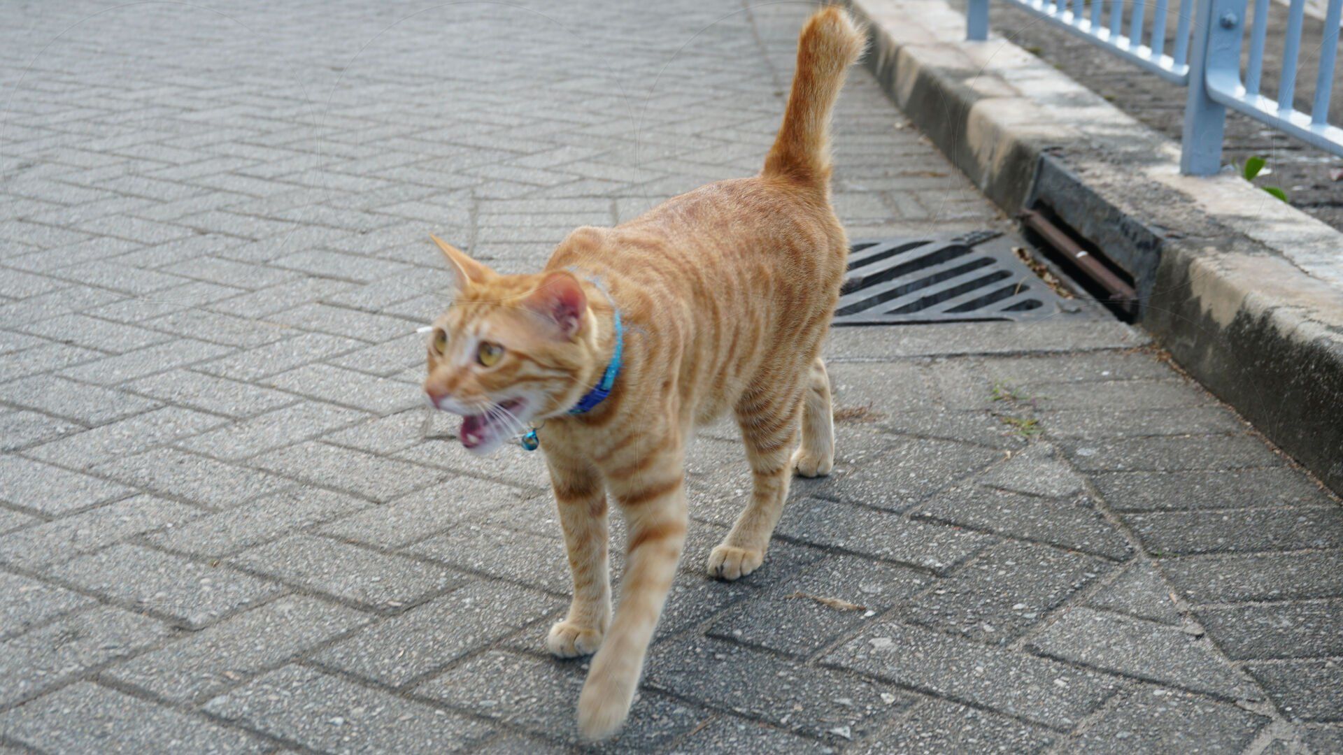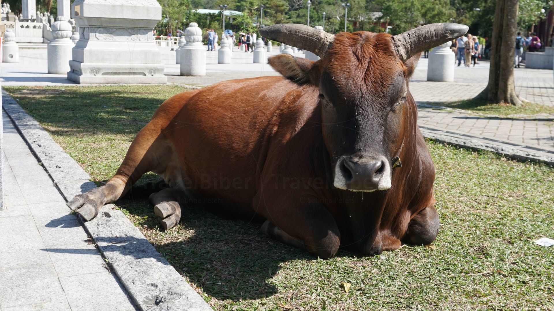 Im Dorf Ngong Ping Village, eine Kuh mitten auf dem Weg.