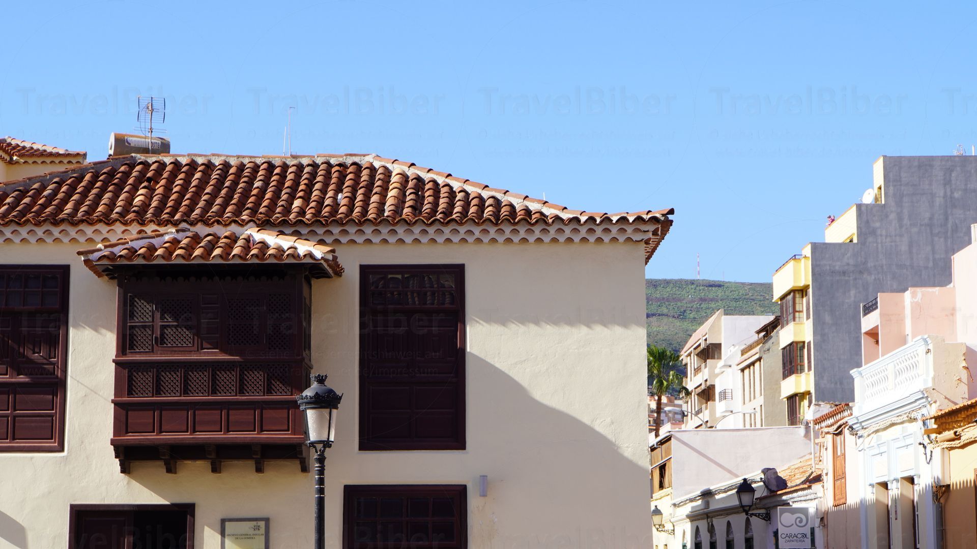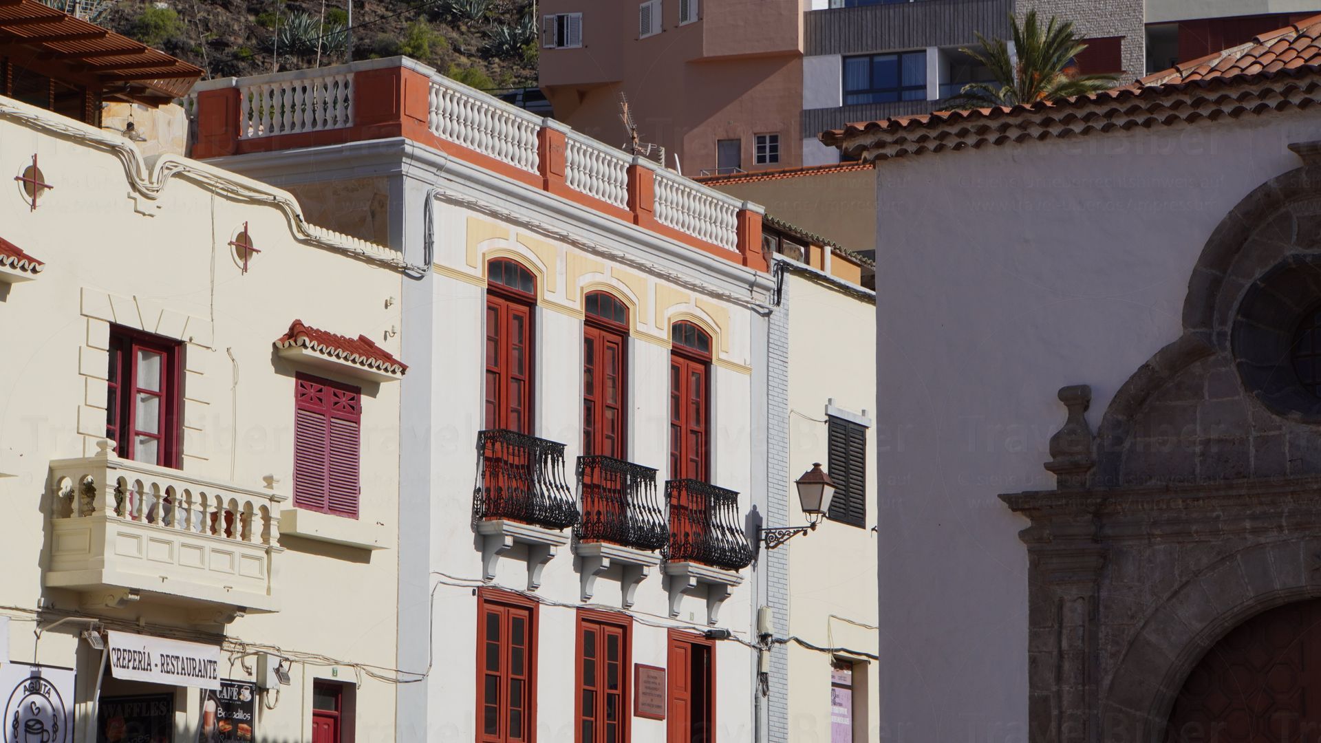 mit Uhrenturm und hölzernen Balkonen im kanarischen Stil.
