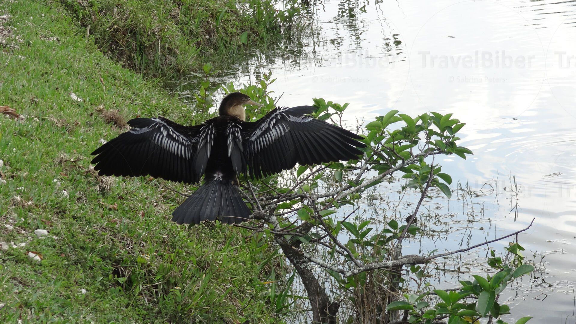 Ein Schlangenhalsvogel, Anhinga, der sein Gefieder nach einem Tauchgang in der Sonne trocknet.