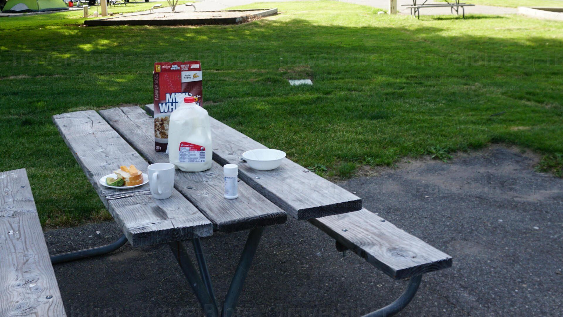 Am nächsten Morgen Frühstück im Freien auf dem Campingplatz nahe Chelan.