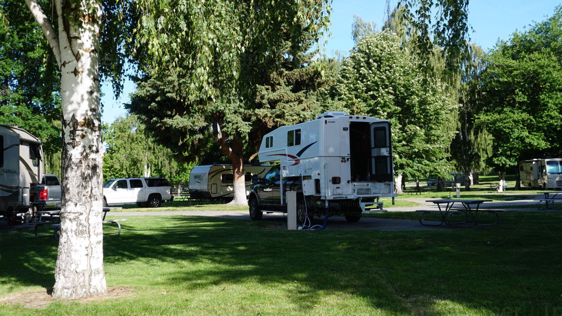 Der Truck-Camper macht sich gut auf dem herrlich grünen Campingplatz bei Chelan.