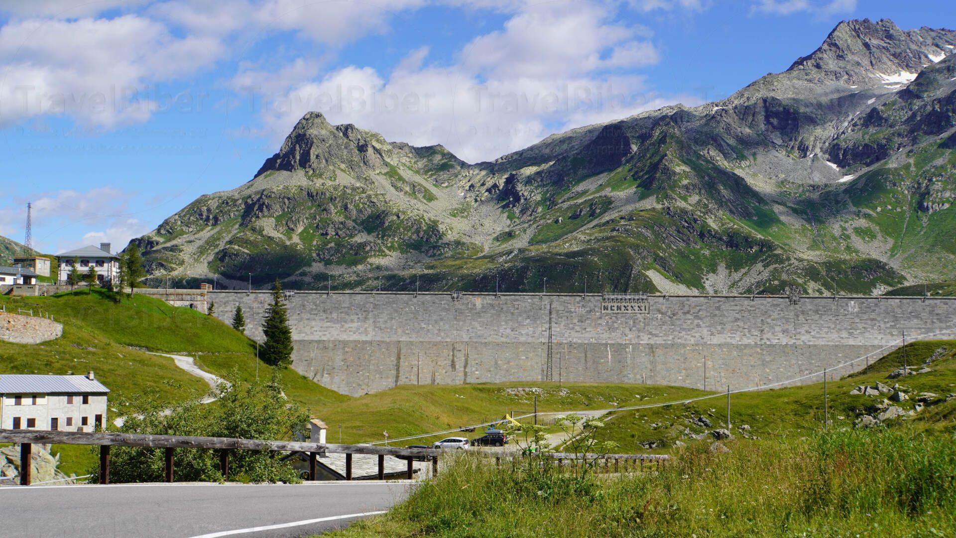 Häuser hinter der Staumauer des Lago di Montespluga.