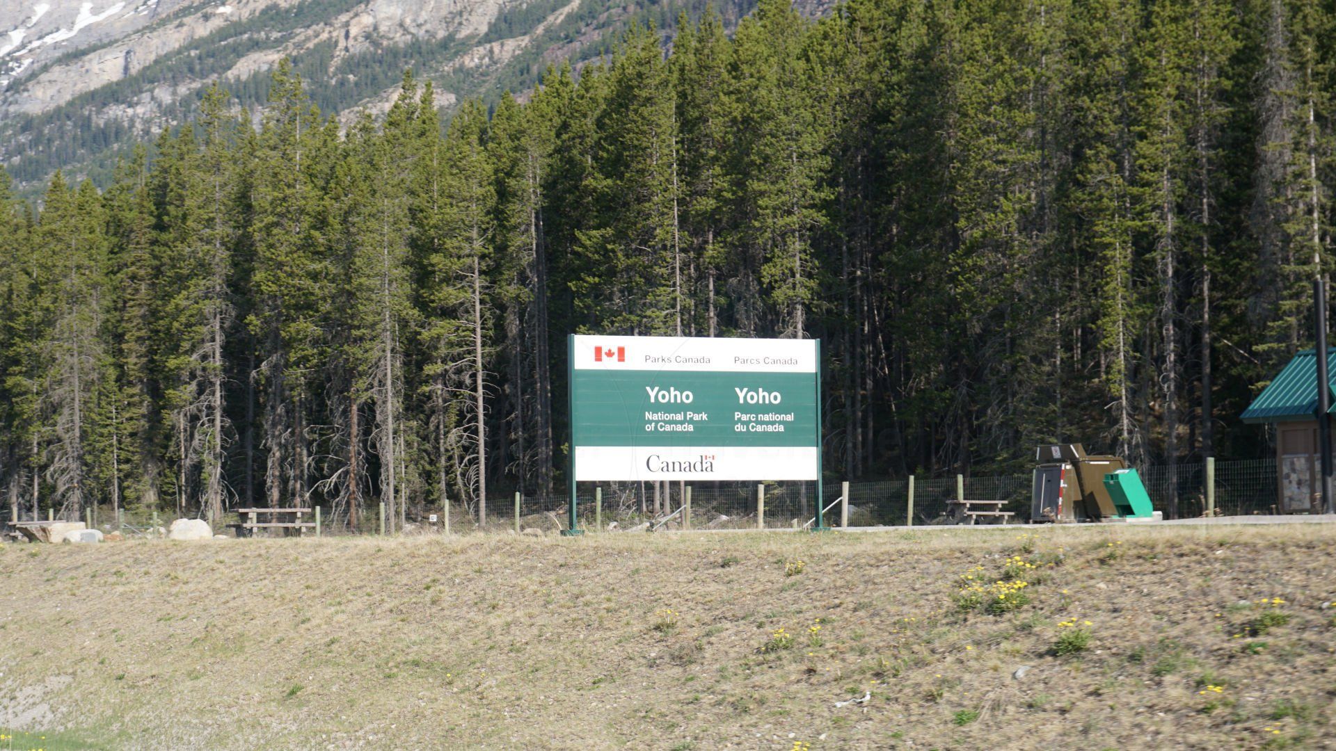 Einfahrt in den Nationalpark, vorbei am Nationalparkschild, auf dem Transcanada Highway.
