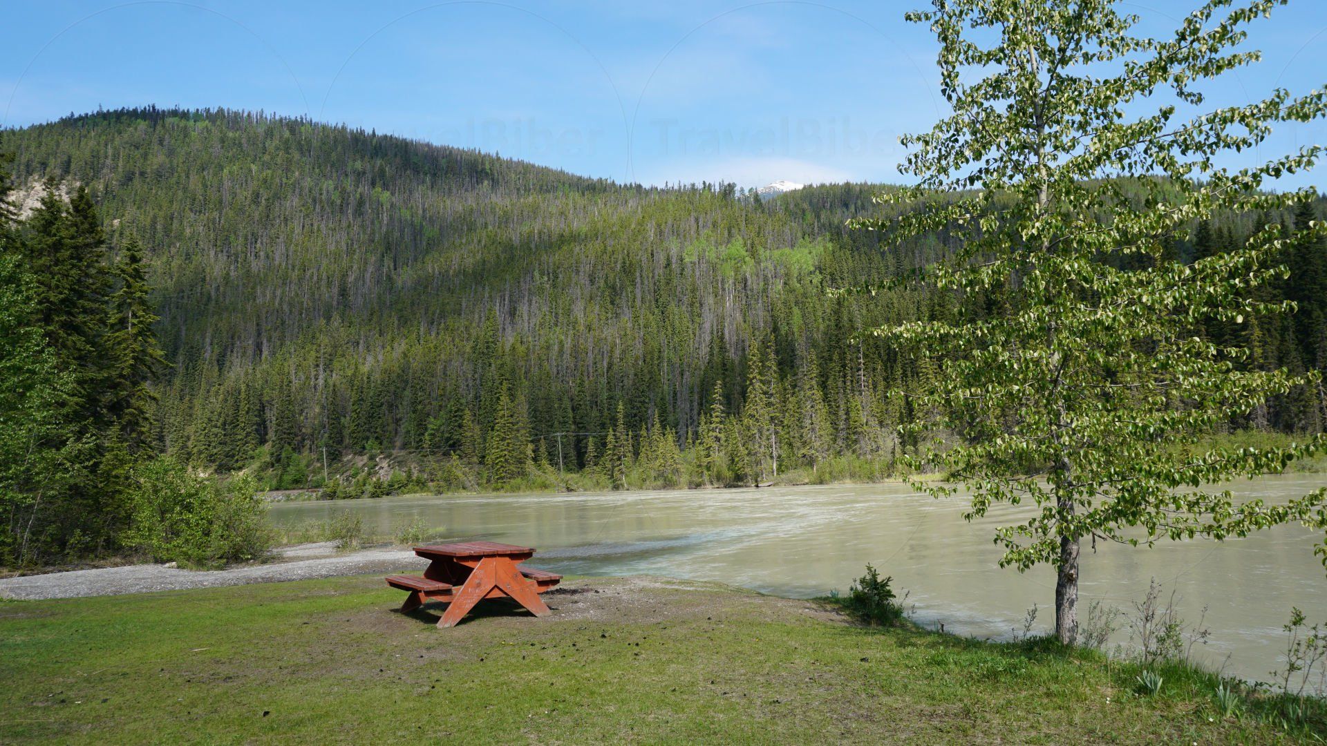 Halt am Fluss, ein typisch kanadisches Bild mit "Drunken Trees" im Hintergrund.