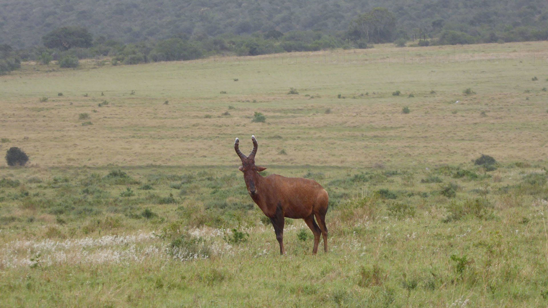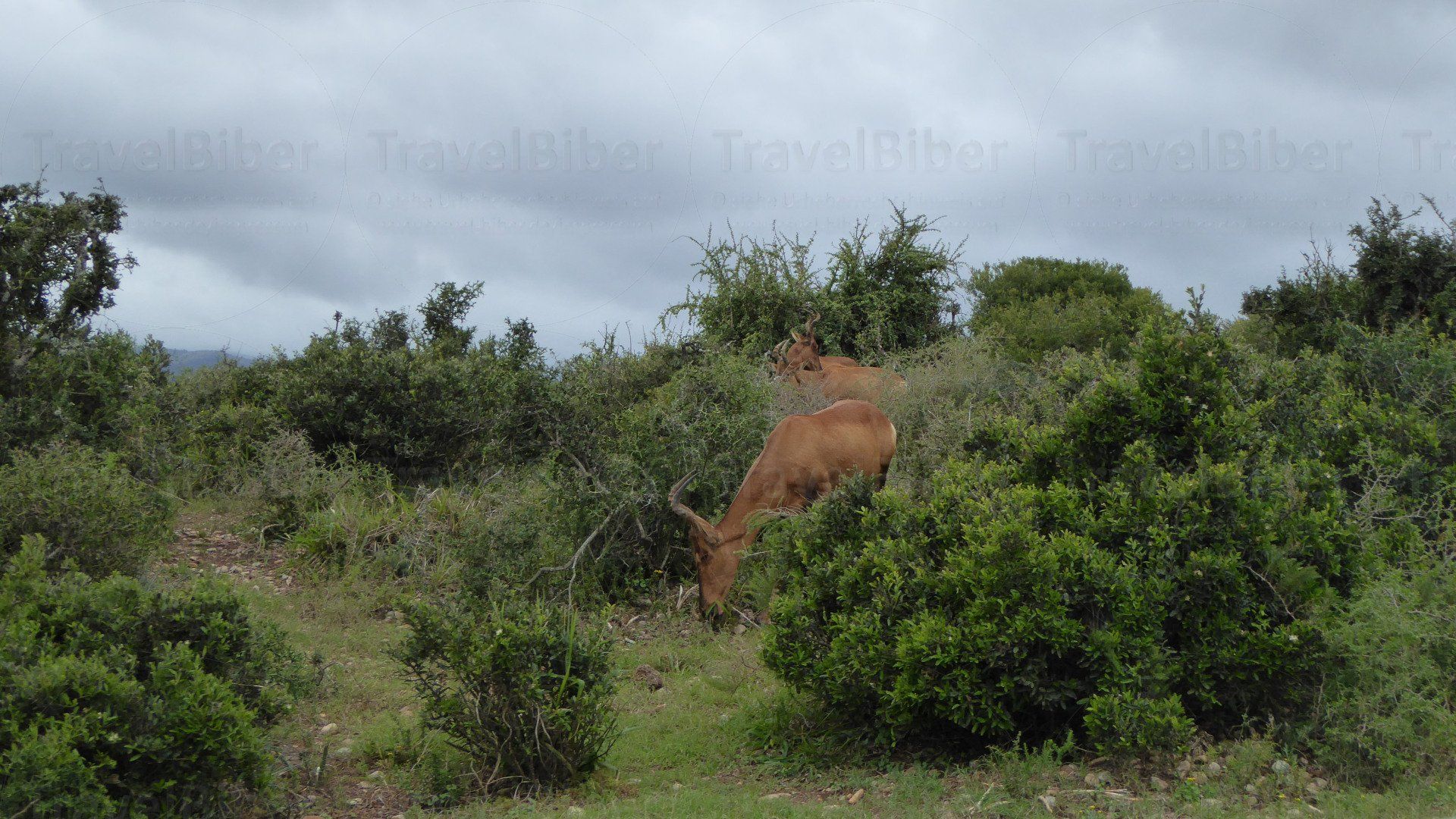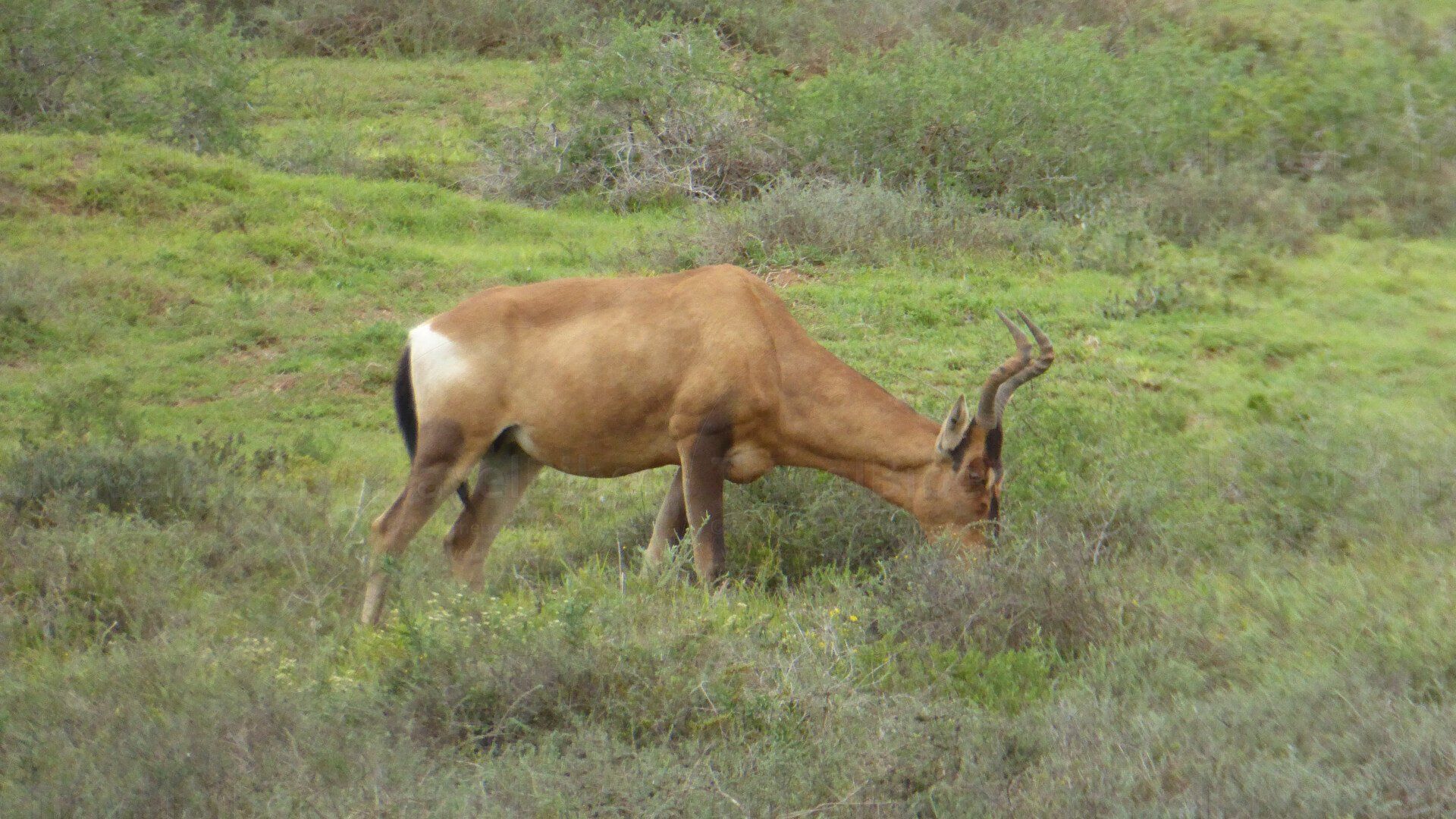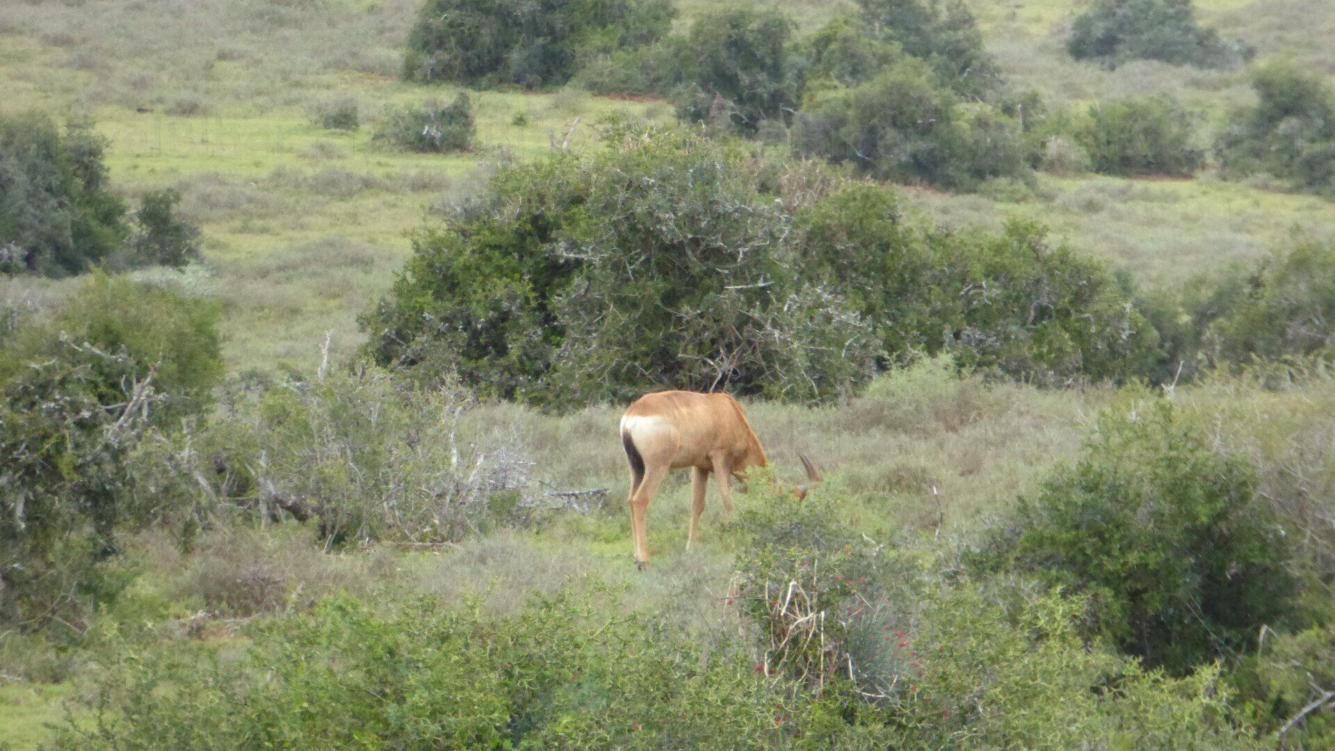 Eine südafrikanische, oder auch rote Kuhantilope genannt, schaut aus dem Busch hervor.